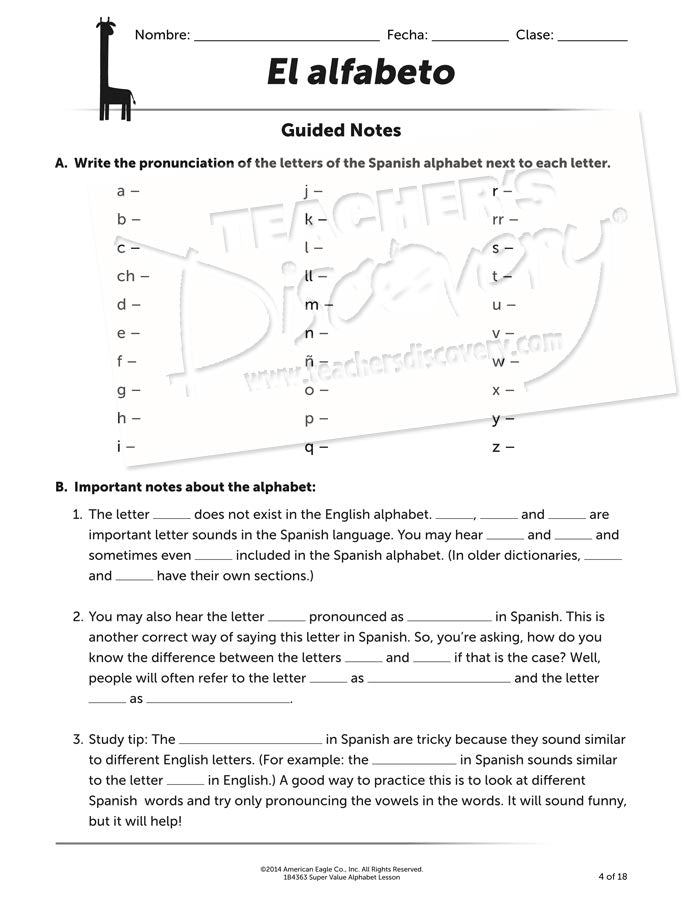 Introduce the Spanish alphabet with “Guided Notes,” practice with a partner activity and some easy and fun games, reinforce with a bingo, then wrap up with a short quiz! SP, ENG. Beginning. 8 x 11 inches. Approximately 14 pages.