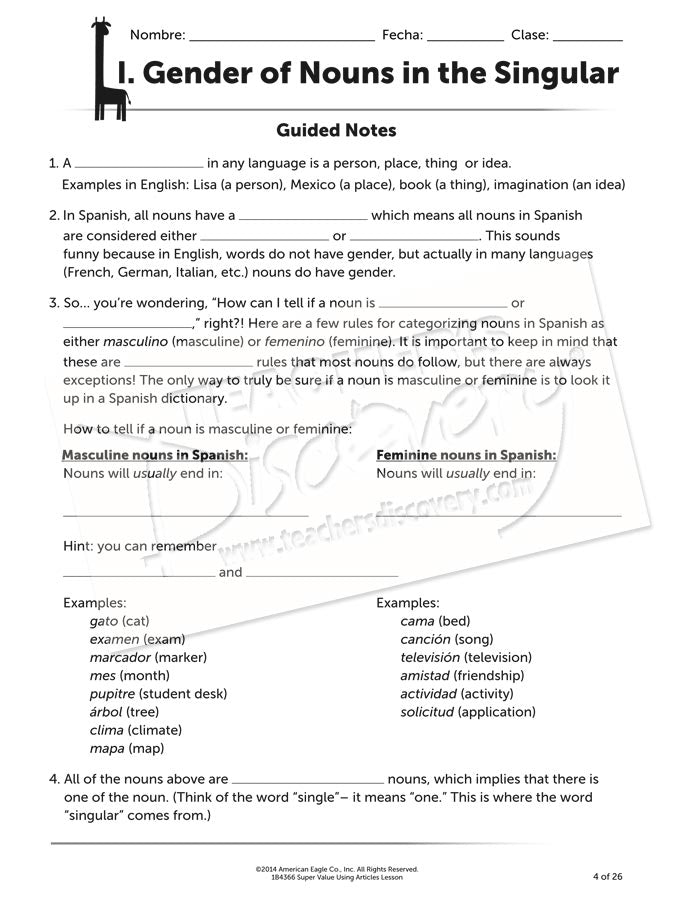 Introduce Spanish articles with “Guided Notes,” practice using them with reproducible worksheets and a few simple games (like “The Masculine and Feminine Game”), then wrap up with a short quiz! ©2014. SP, ENG. Beginning. 8 x 11 inches. Approximately 22 pages.