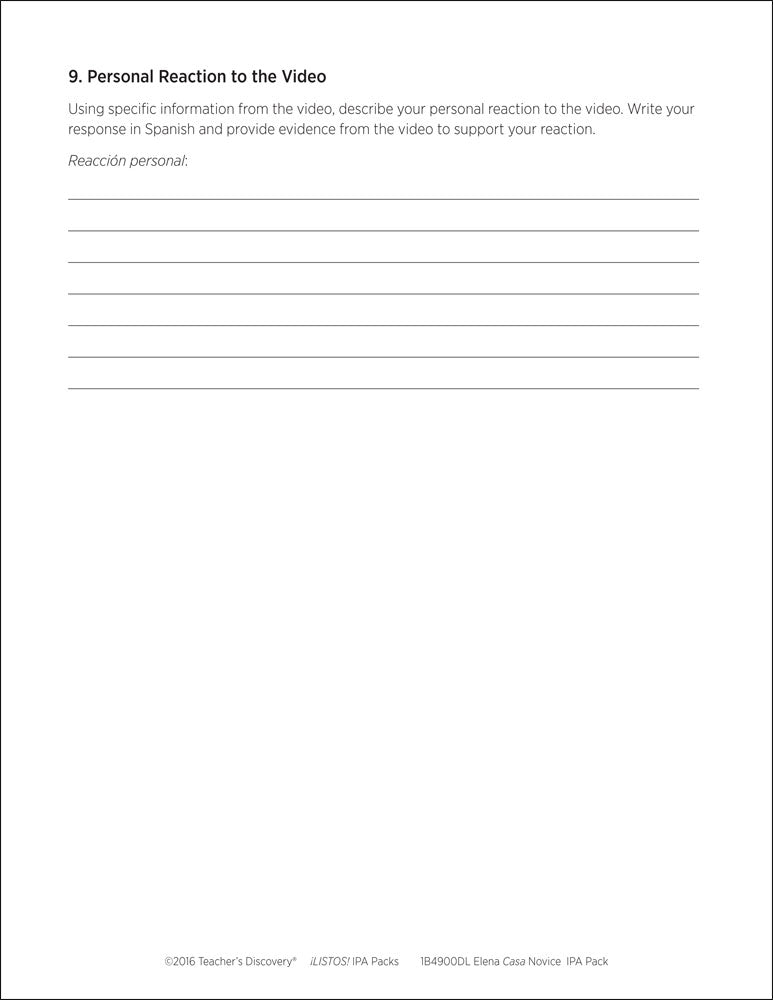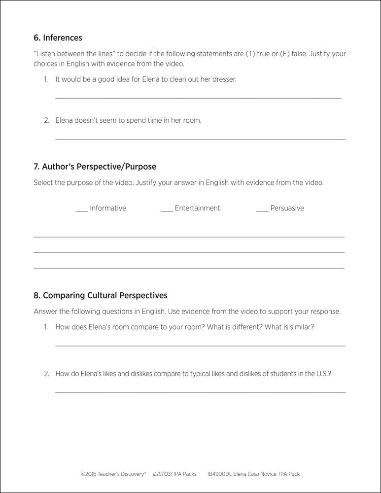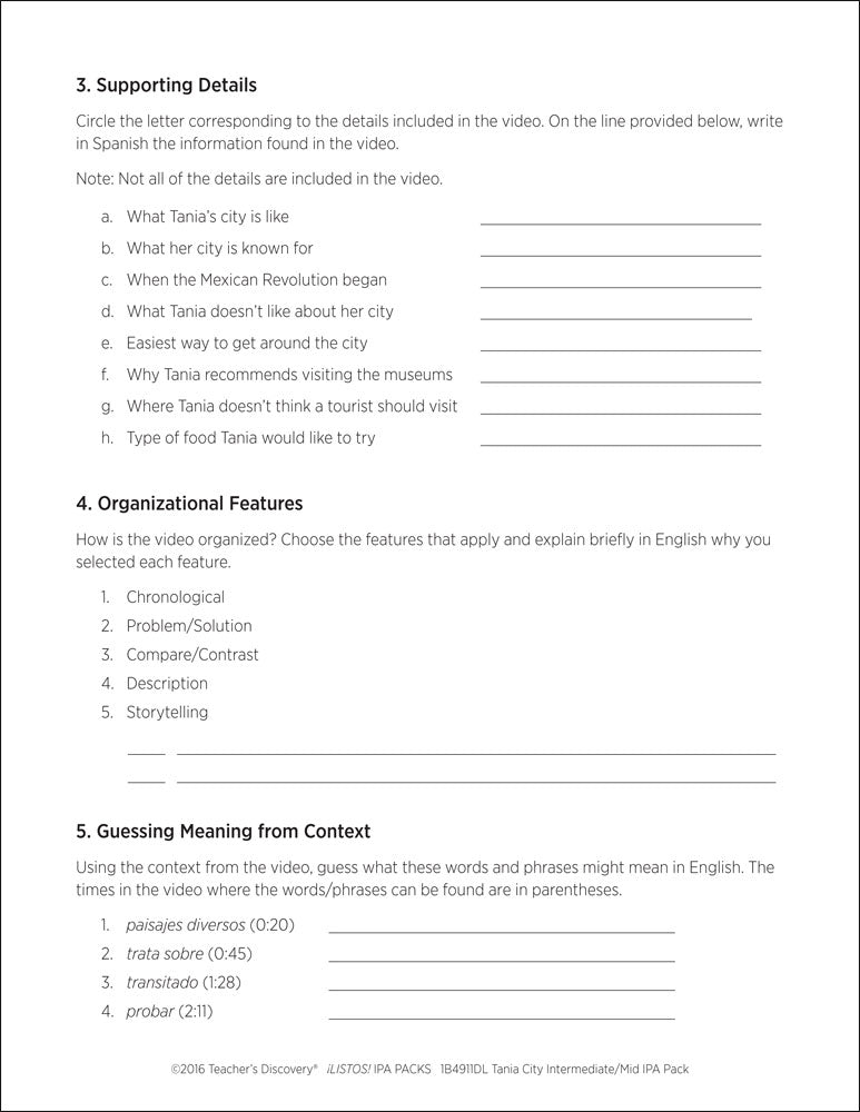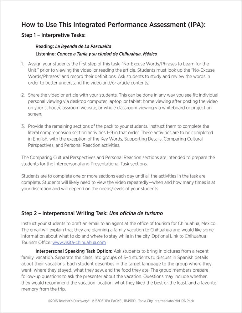 This pack includes step-by-step instructions, and reading and listening comprehension activities that follow the ACTFL model. Complete with an explanation of an IPA and how to use it, and nine Interpretive Tasks that break down the content, increase recognition of key words and phrases, develop context awareness, and promote language usage. In addition, it provides creative options for writing and/or speaking Interpersonal and Presentational Tasks, answer keys, and intermediate-level rubrics for each mode.