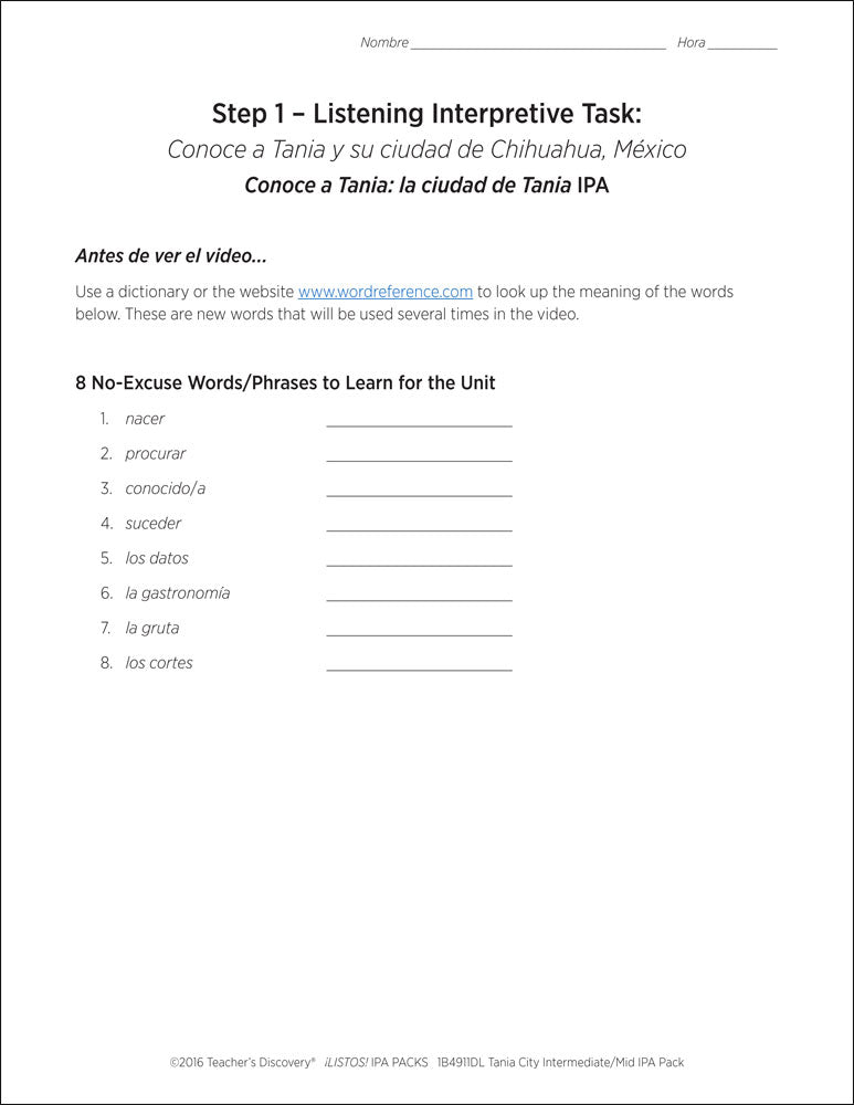 This ¡LISTOS! IPA Pack is based on two authentic resources: a short historical legend and an exclusive two-minute video filmed in Mexico, of Tania describing the things she likes and doesn’t like about living in the city of Chihuahua in 100% Spanish.