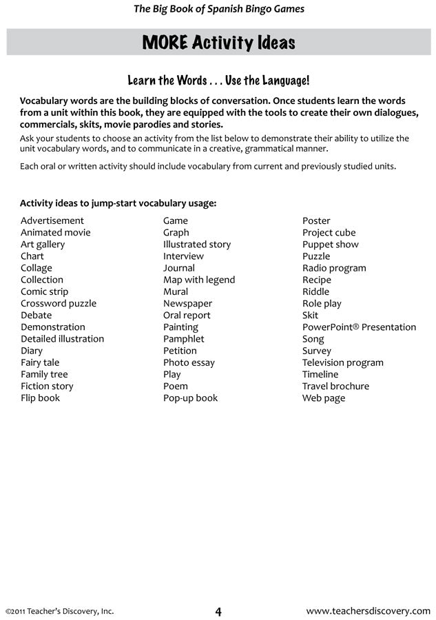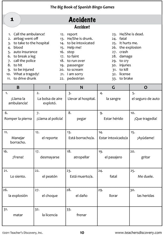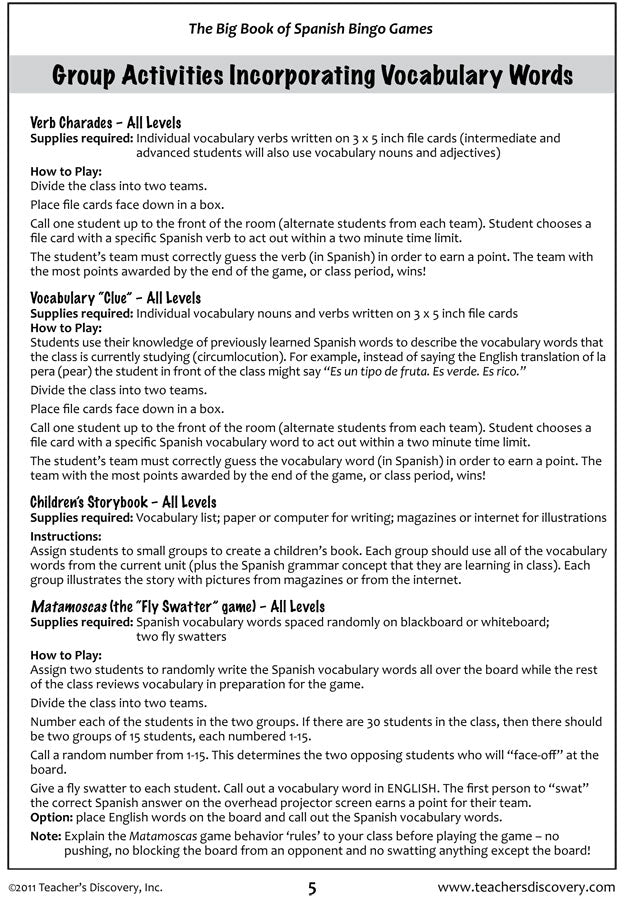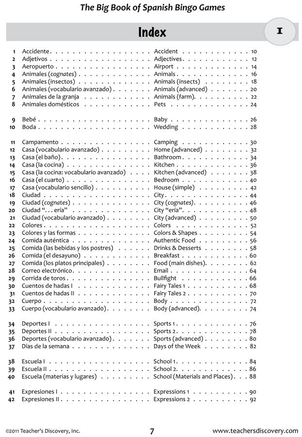 Simplify your life and power up your students' conversation skills with this incredible bingo game collection featuring high-use Spanish words and universal curriculum topics. Bingo inspires lively student participation and takes the drudgery out of word memorization and review.