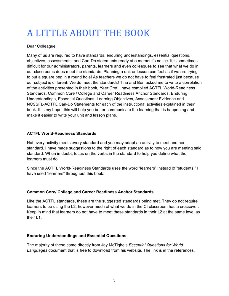 The Common Core State Standards weren’t designed for world language teachers, and the ACTFL World-Readiness Standards weren’t designed for acquisition-focused teaching, but that doesn’t mean you can’t apply them to your instruction and planning! However, it requires thoughtful analysis of classroom practices and a thorough knowledge of the standards to fit the square peg into the round hole. Cameron Taylor expertly does it for you, listing World-Readiness and Common Core standards, enduring understandings and essential questions, learning objectives, assessment evidence, and Can-Do statements for every activity from Year One (1B6377).