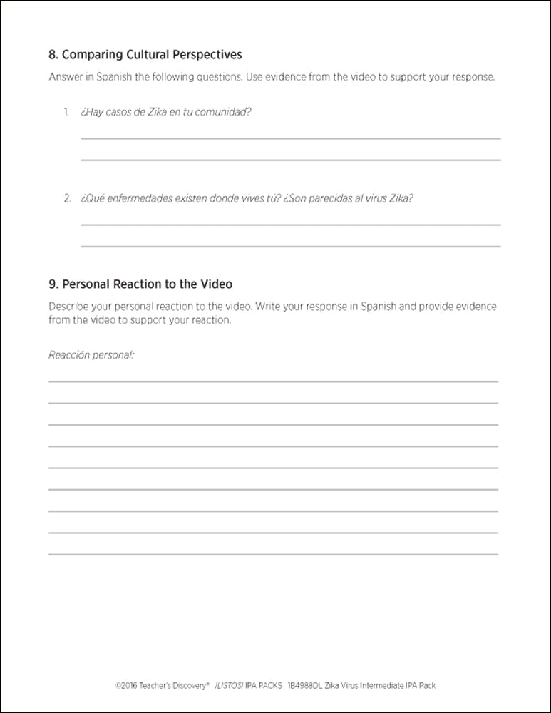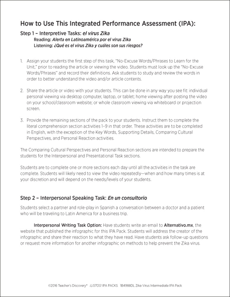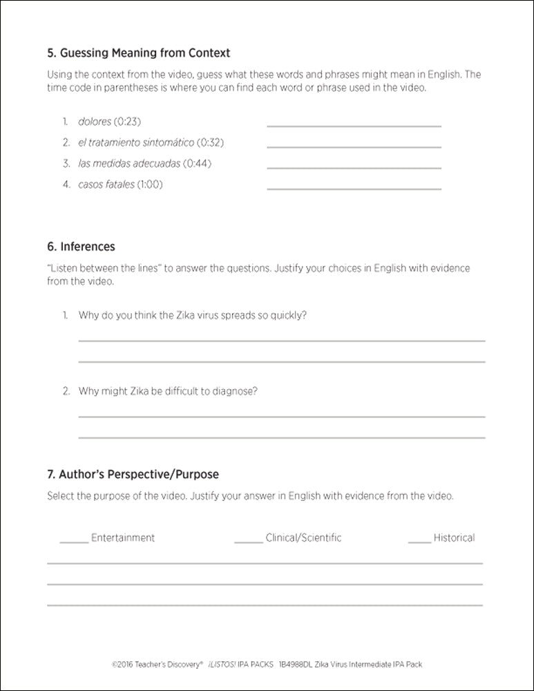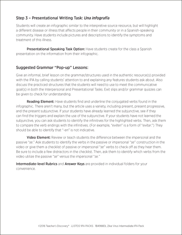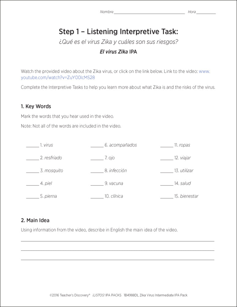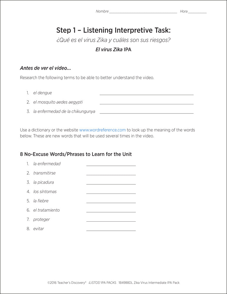 This ¡LISTOS! IPA Pack download is based on two authentic resources: an infographic and a two-minute news report style video explaining what Zika is and the risks of the virus to the community in 100% Spanish.