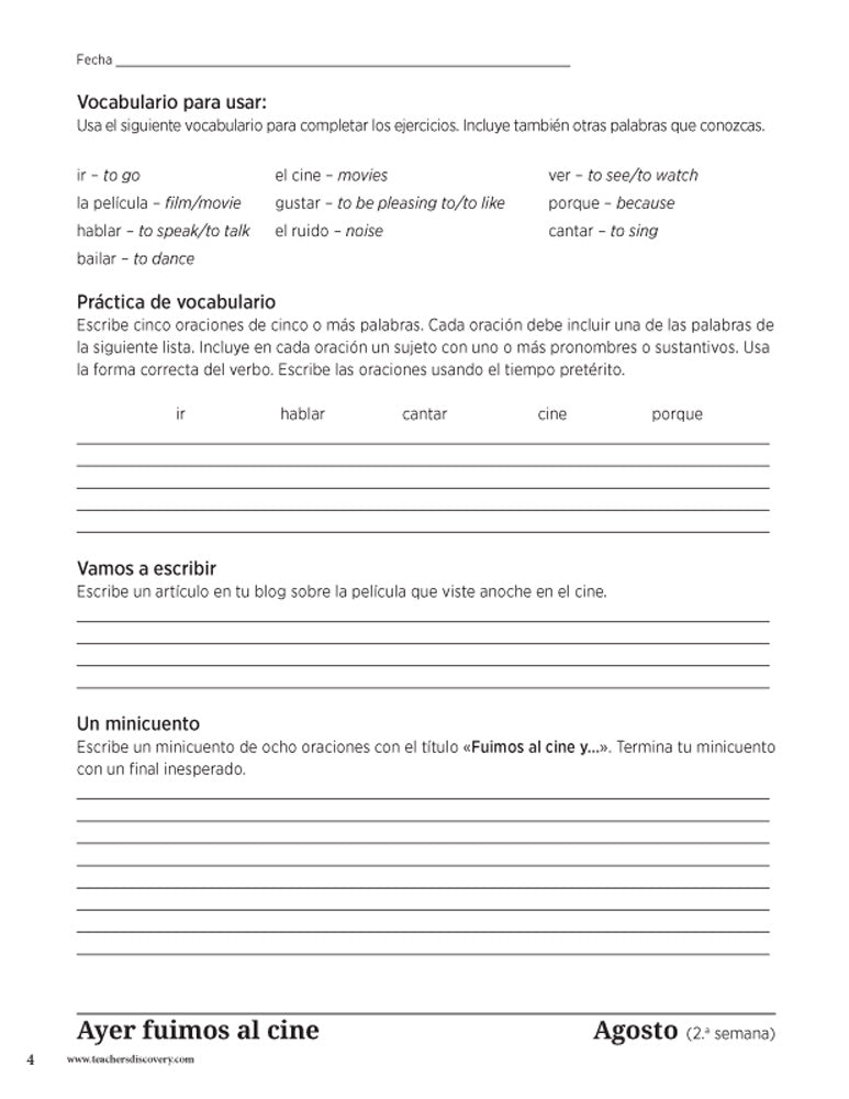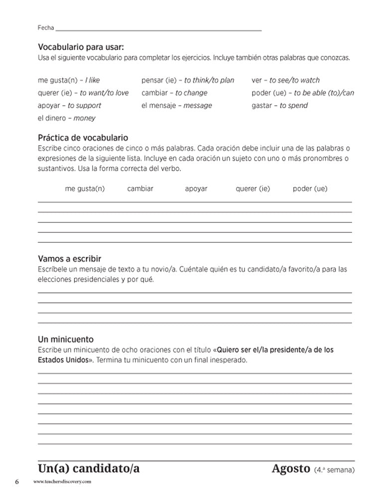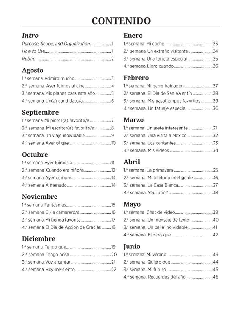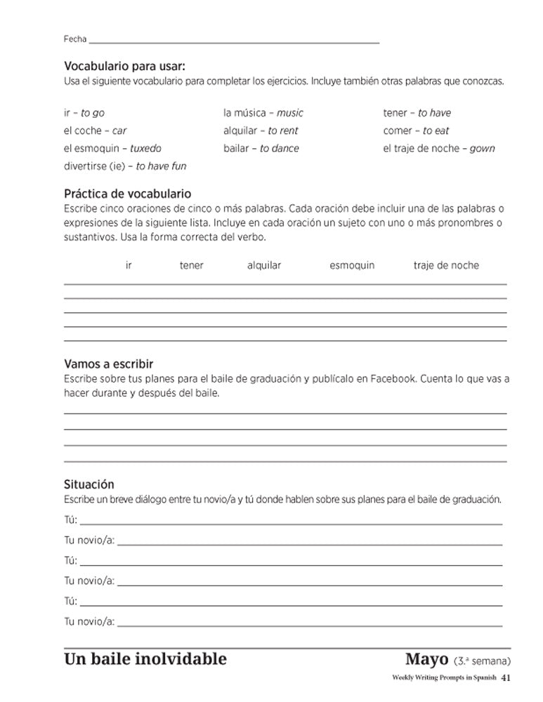 Assign one writing prompt a week—they’re designed to be in sync with the events of a teenager’s school year! Each prompt in the book introduces high-frequency vocab and teen relevant terms, then gives a few manageable tasks to practice the new words—such as writing a text message, an ad to sell something, a short poem, a mini-story with a particular character or setting, or a fictional conversation between two people. Intermediate-level instructions are in Spanish.
