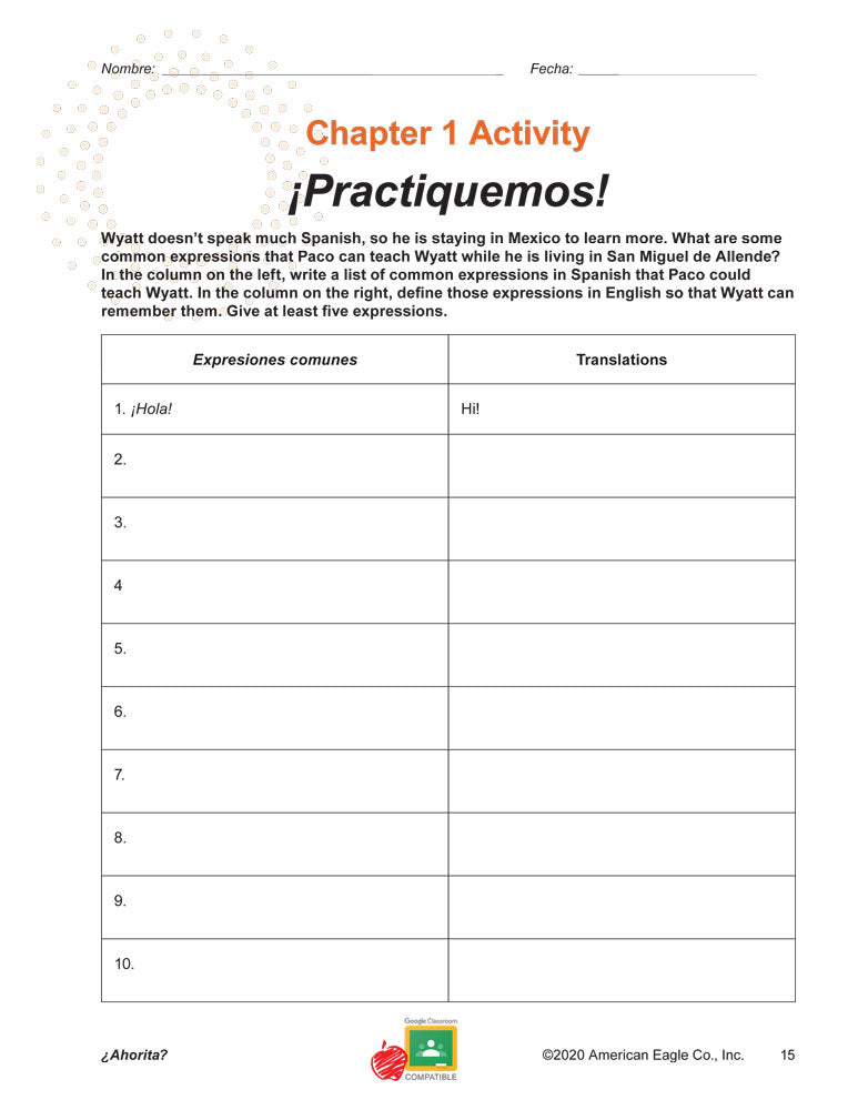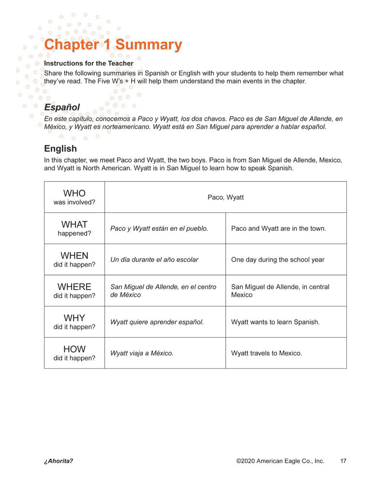 Teacher's Guide and Student Activities: ©2020. Spanish, English. Level 1. High school. 8.5 x 11 inches. PDF download, 93 pages.