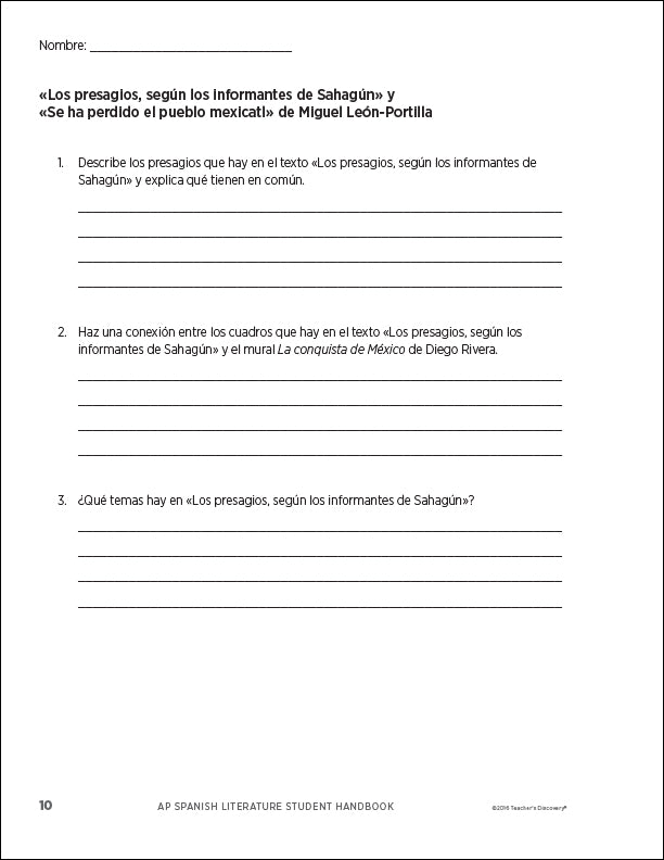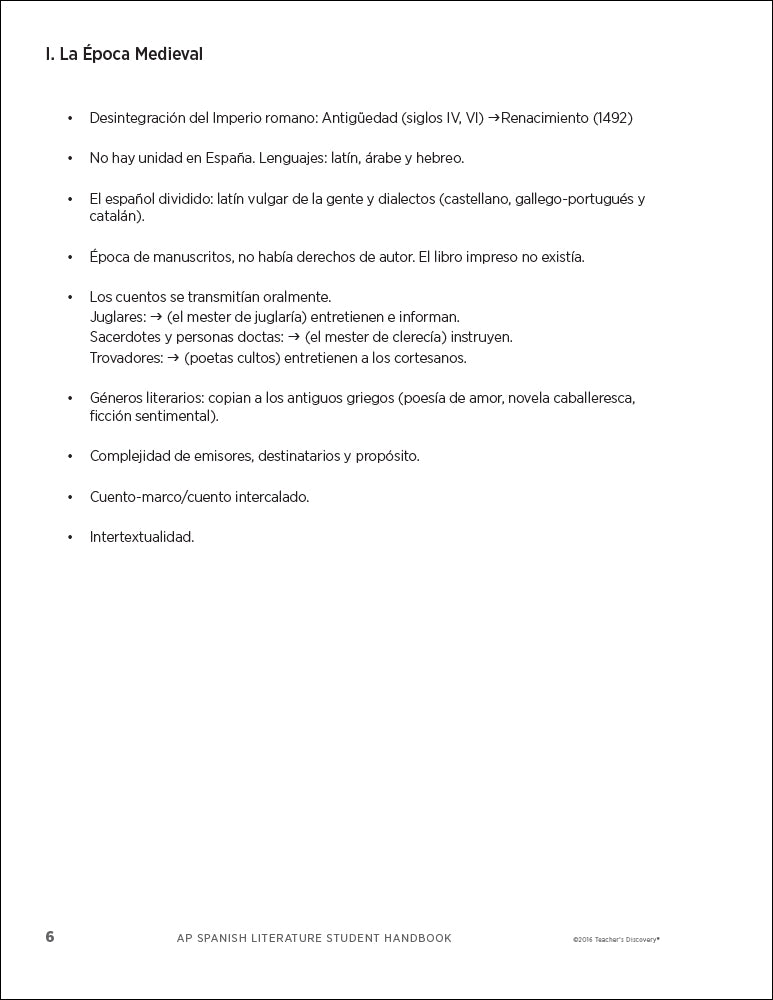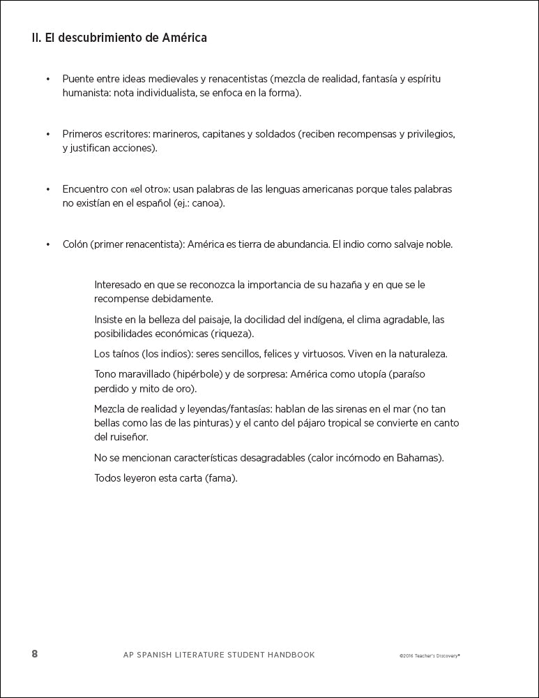 Regardless of the anthology you’re using, this handbook provides supplemental materials to help students contextualize each text on the AP Spanish Literature exam. It approaches the exam in a chronological manner: la Época Medieval, la Conquista, el Siglo de Oro, el Romanticismo, el realismo y el naturalismo, la generación del 98, la vanguardia y el Boom (la literatura chicana y la voz femenina contemporánea).