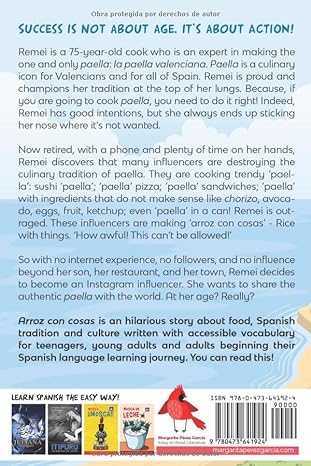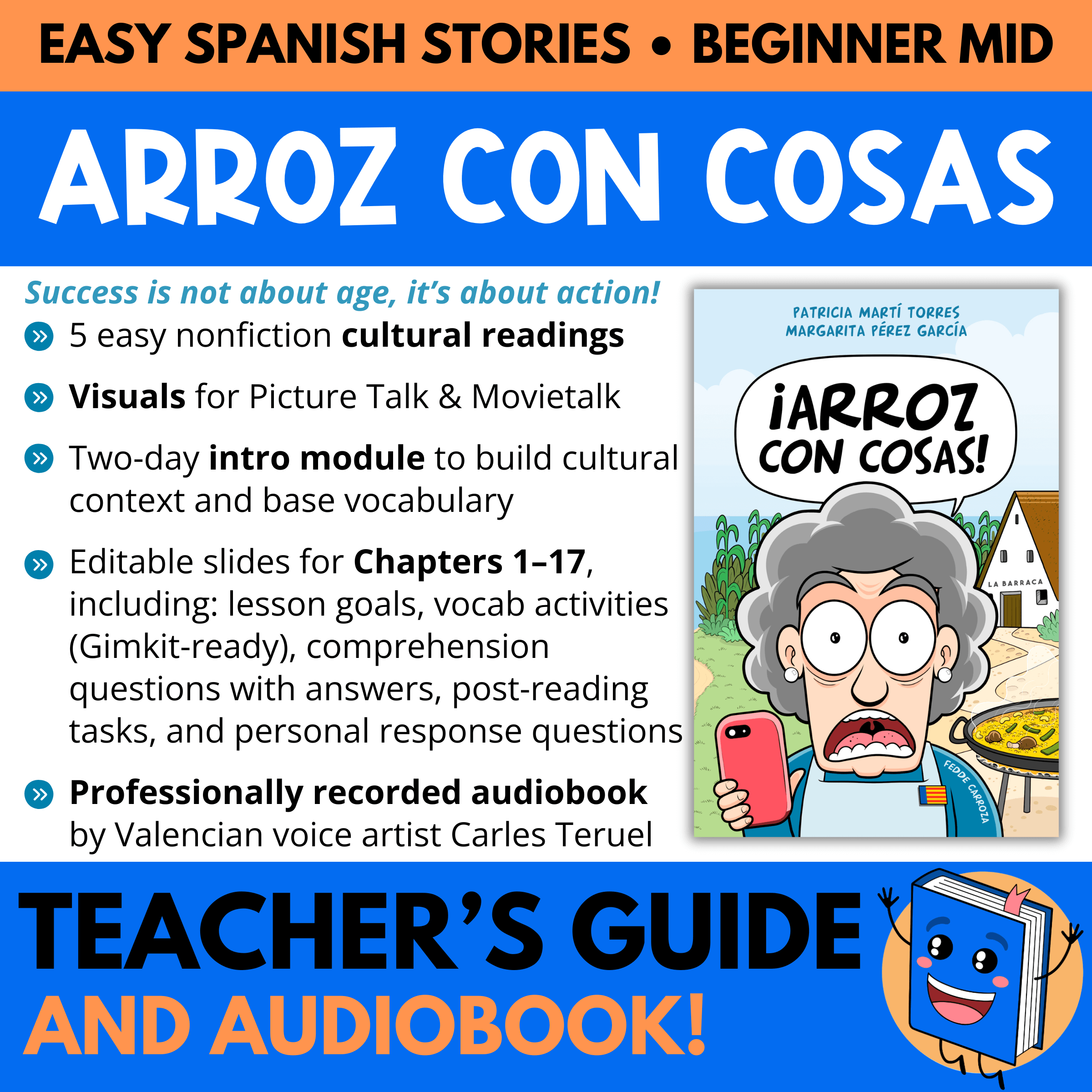 Professionally Recorded Audiobook by Valencian voice artist, Carles Teruel. Perfect for enhancing pronunciation, listening skills, and supporting independent reading.is paella?", "What is arroz con cosas?", paella songs and adverts, photos of arroz con cosas, Fallas celebrations involving paellas, controversial paellas, and official paella emojis.