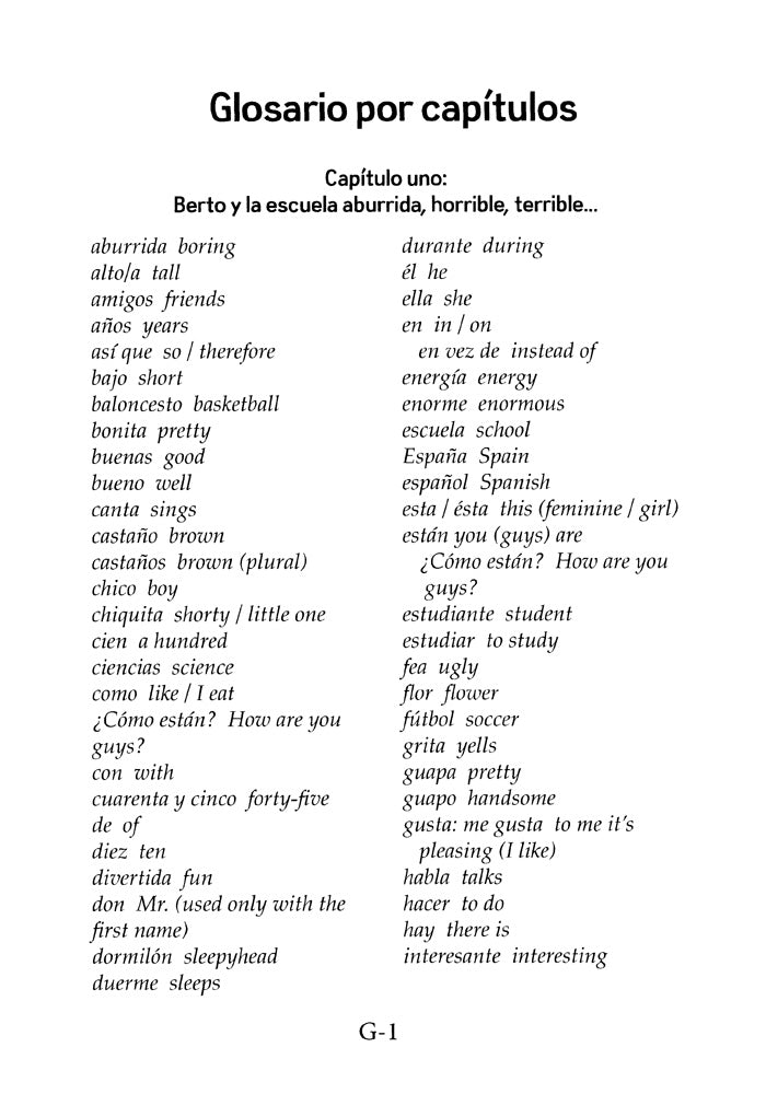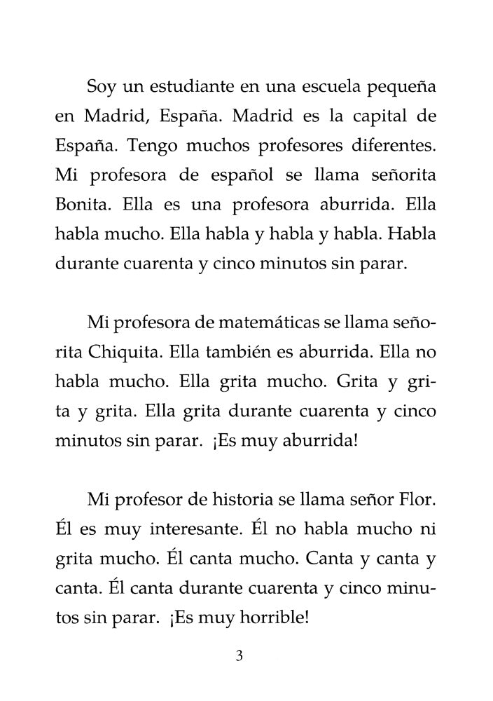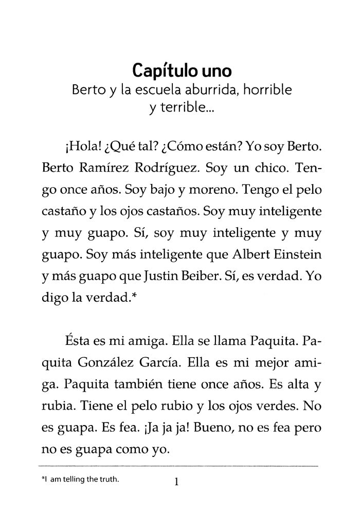 Berto is an eleven-year-old boy who lives in Madrid, Spain. Poor Berto has one big problem. He does not like school. He does not like to study. He does not like to do homework. Besides, his teachers are really strange. Fortunately, Berto has a lot of good ideas … but are they really? Mas breve y mas facil que Pobre Ana. ¡Muy divertido! Berto y sus buenas ideas is specifically designed for true beginners. The amusing story is entirely in Spanish, is shorter and easier than the popular Pobre Ana, and contains a glossary.