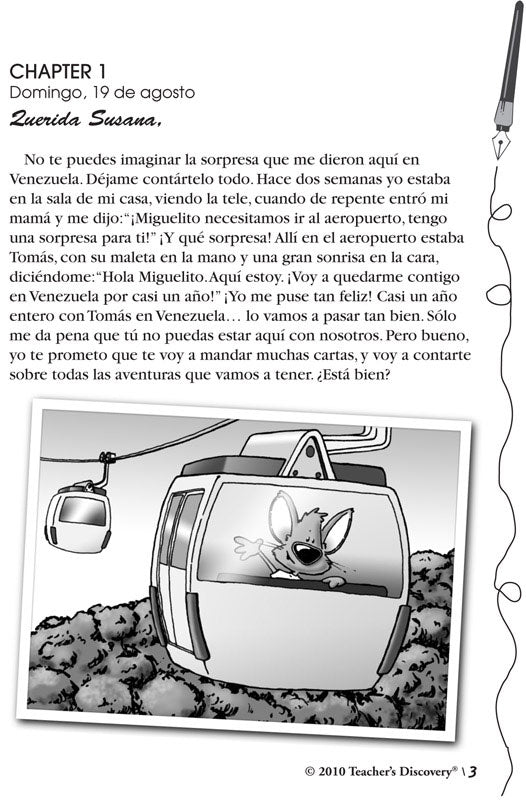 Miguelito is happily surprised when his good friend Tomás (an American mouse) arrives in Venezuela as an exchange student. The two go to school together, but also travel throughout the country and experience different aspects of Venezuelan culture. Every month Miguelito writes a detailed letter to Susana (their friend in Maine), telling her about their many adventures: riding the teleférico up the mountain, El Ávila in Caracas, traveling to see la Isla Orquídea in Canaima, visiting Lake Maracaibo, and dancing el merengue and la salsa at a local fiesta.