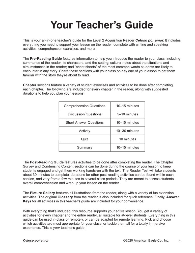 This all-in-one, remote-friendly, reproducible teacher’s guide gives you everything you need to support your lesson on the Level 2 Acquisition Reader Celoso por amor. You get: