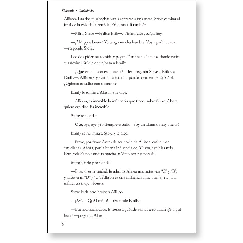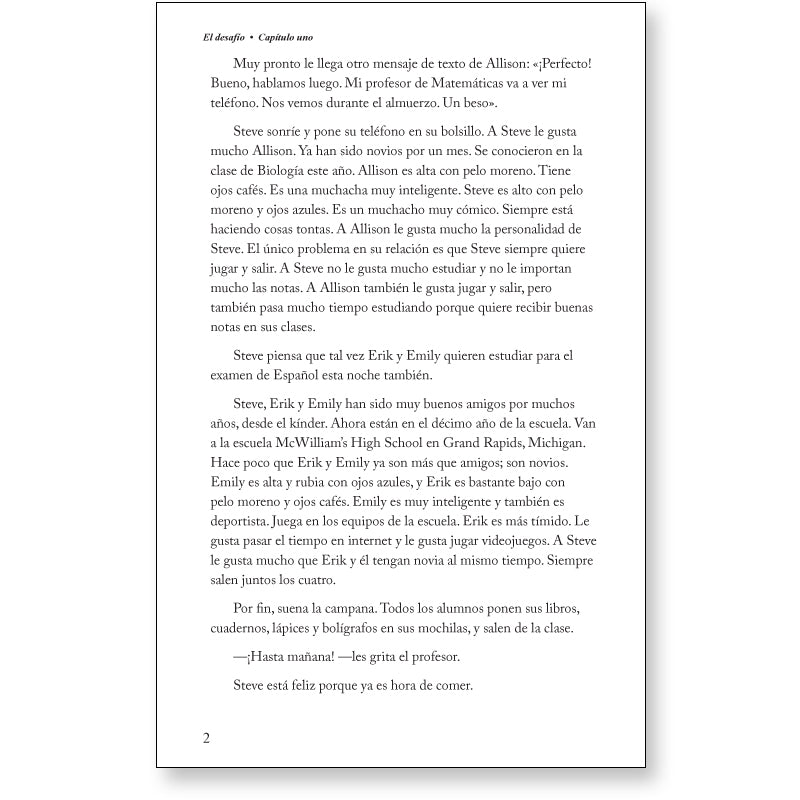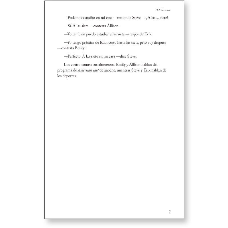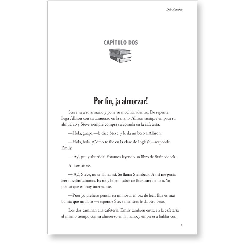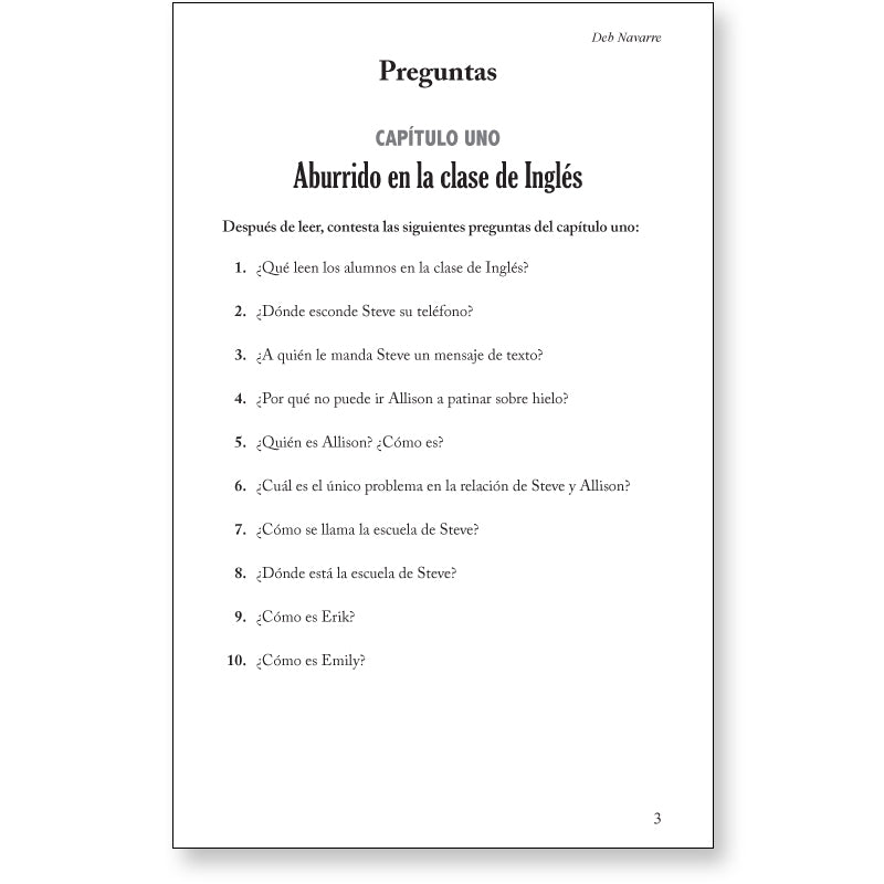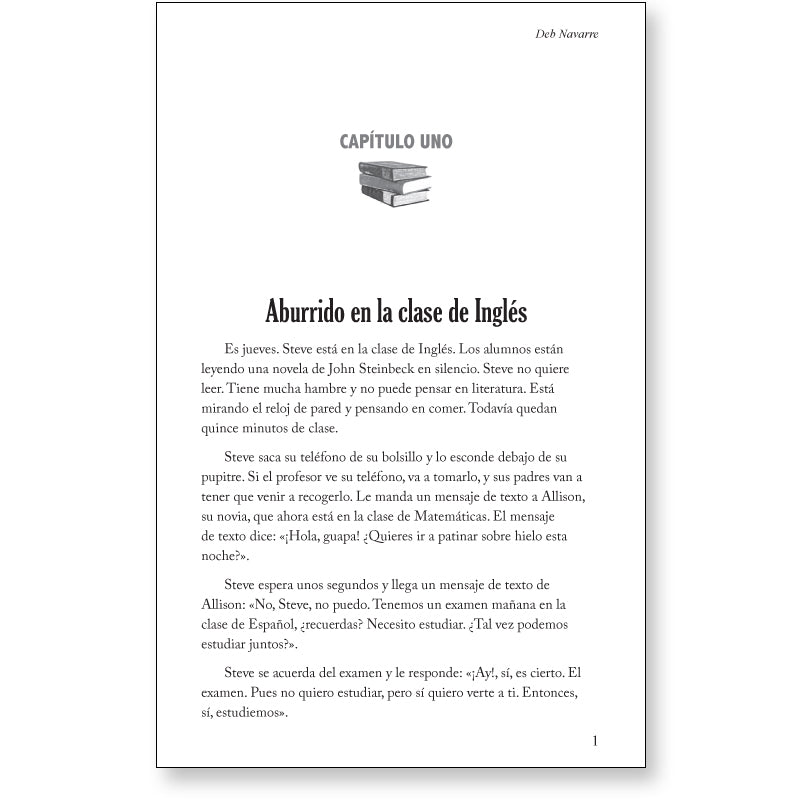 Spanish students are powerless to resist these tales of homework and heartbreak, travels abroad and troubles at school, young love and true friendship! Relatable characters and school-appropriate yet teen-relevant themes draw students in, immersing them in first-year grammar and vocabulary topics. Use Deb Navarre readers with your Level One Spanish classes or as review with higher levels. This highly readable series is written almost entirely in the present tense, and each one is supported by a thorough glossary containing all the structures and vocabulary used in each reader. Comprehension questions in Spanish at the end of each chapter help students check their understanding. The best way to encourage reading in any language is to provide interesting content. Deb Navarre readers are full of themes teens want to read about!