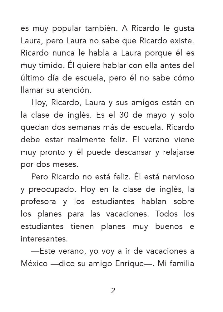 Ricardo Sánchez is a typical 13-year-old from Texas. He has a good group of friends, and a lot of classes with Laura, the girl he likes. But he just can’t seem to get Laura’s attention. With only two weeks until summer vacation, Ricardo and his friends are excited to talk about their plans. There’s just one problem—Ricardo doesn’t have any! When he sees Laura interested in his friend Felipe’s plans, Ricardo has to do something! But what can he do? And what will it ultimately cost him?