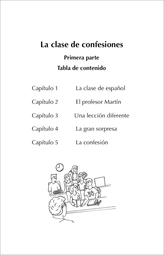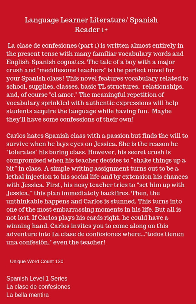 La clase de confesiones is written almost entirely in the present tense with many familiar vocabulary words and English-Spanish cognates. The vocabulary contained in the novel relates to school, basic TL structures, and, of course, el amor.