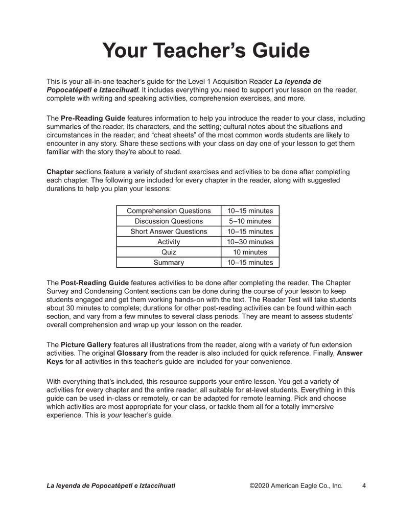 This all-in-one, remote-friendly, reproducible teacher’s guide gives you everything you need to support your lesson on the Level 1 Acquisition Reader La leyenda de Popocatépetl e Iztaccíhuatl. You get: