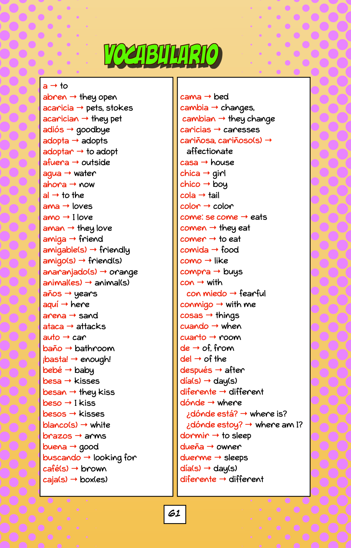 translations on the same page, and a full vocabulary list is included at the end. The goal is to make learning Spanish fun and effortless.