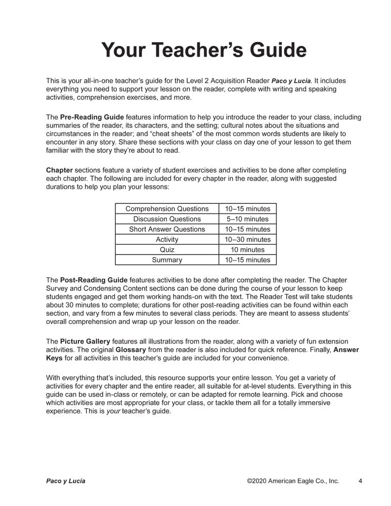 This all-in-one, remote-friendly, reproducible teacher’s guide gives you everything you need to support your lesson on the Level 2 Acquisition Reader Paco y Lucía. You get:
