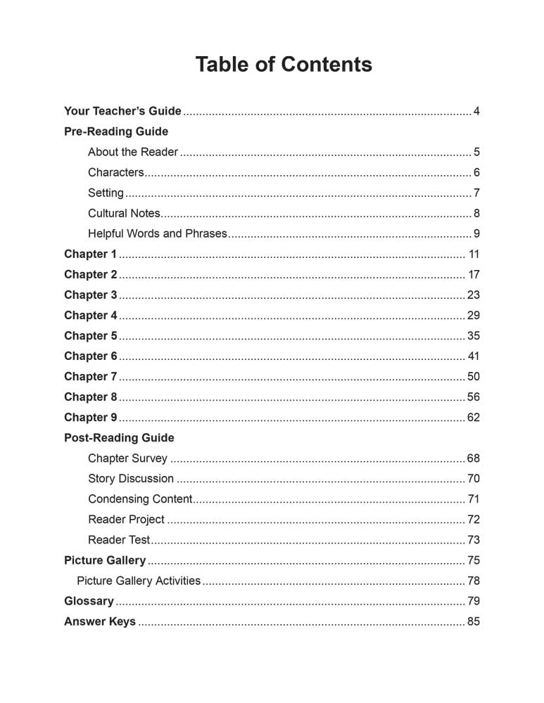 - Post-Reading Guide: A chapter survey, story discussion, writing activities to work directly with the story, a reader project, and a reader test