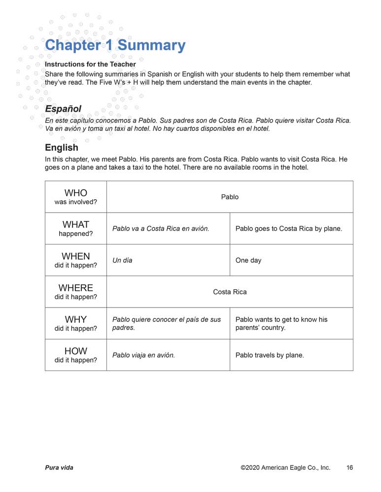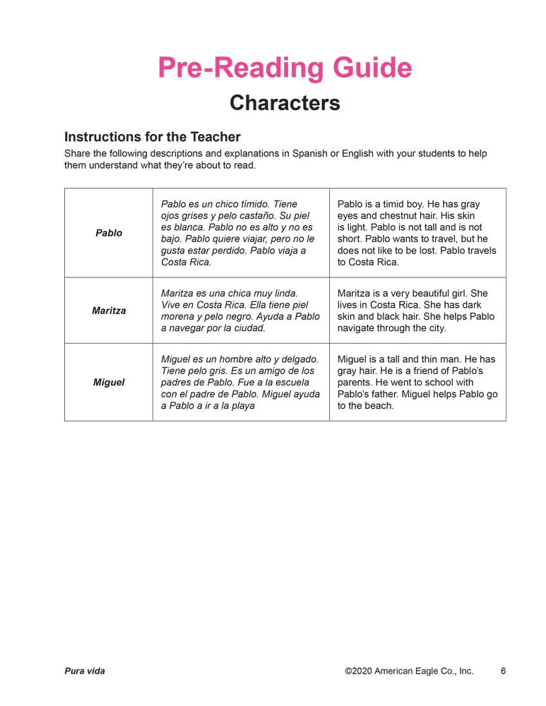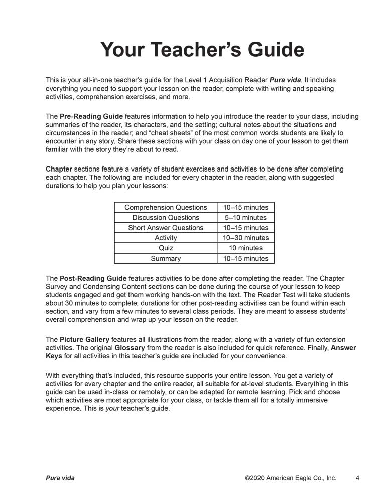 This all-in-one, reproducible teacher’s guide gives you everything you need to support your lesson on the Level 1 Acquisition Reader Pura vida. You get: