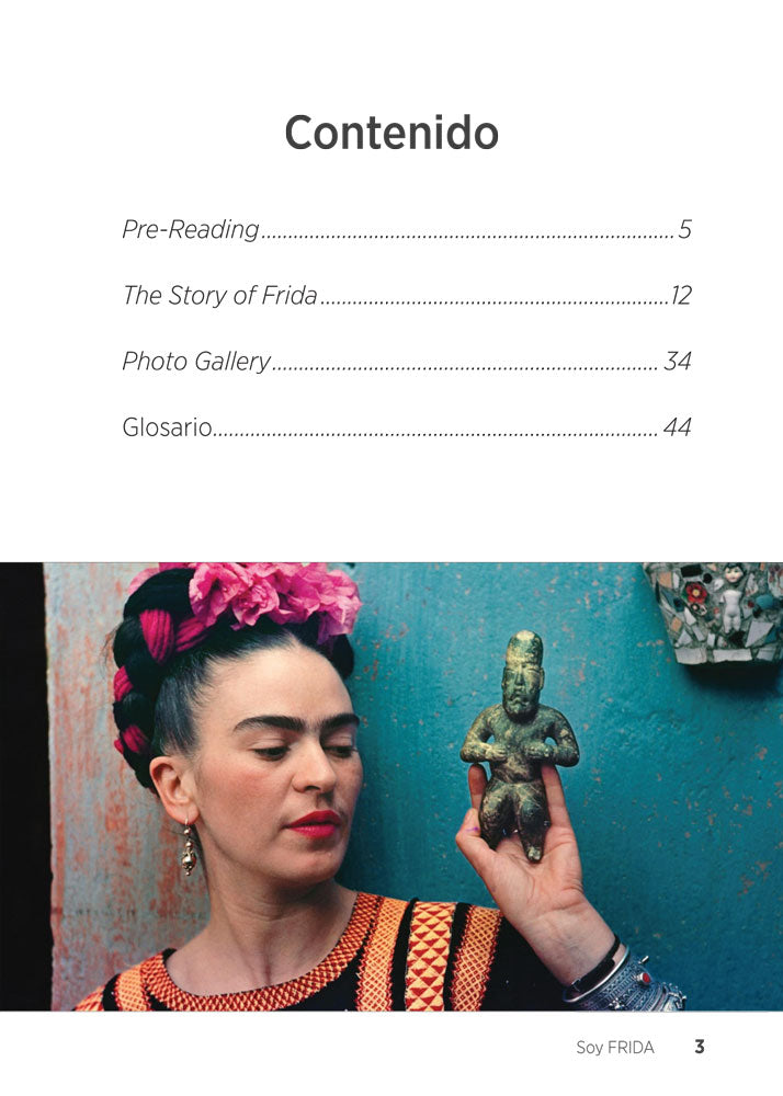 Learn about Frida and her most famous paintings in a Level 1 Spanish reader. Artfully written by Gail Bellamy and Vicki Draeger, and translated by Sonia Dolores Estrada Morales, this present tense book talks about Frida’s life story and how her past affected the works she painted.