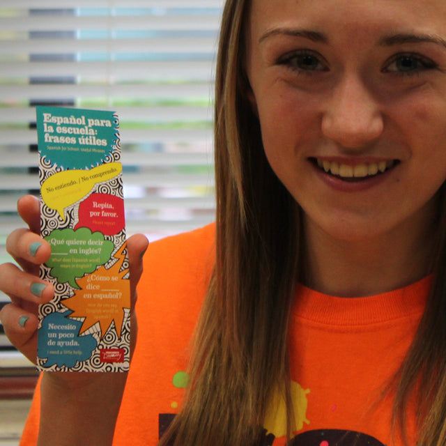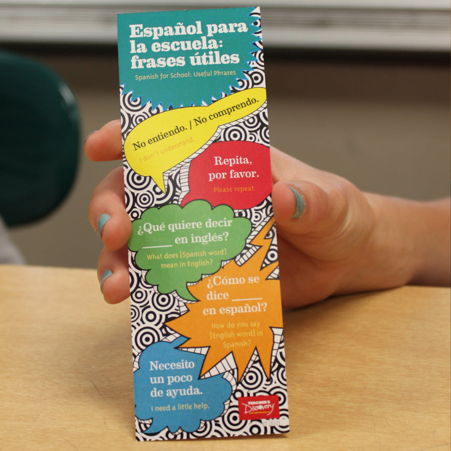 Get your students using more Spanish in the classroom! These cool bookmarks are packed with phrases that are useful in school so they won’t have the excuse of not knowing what to say. Bookmarks measure 2 x 6 inches. Glossy full color on the front, black and white on the back. Package of 100. Cardstock.