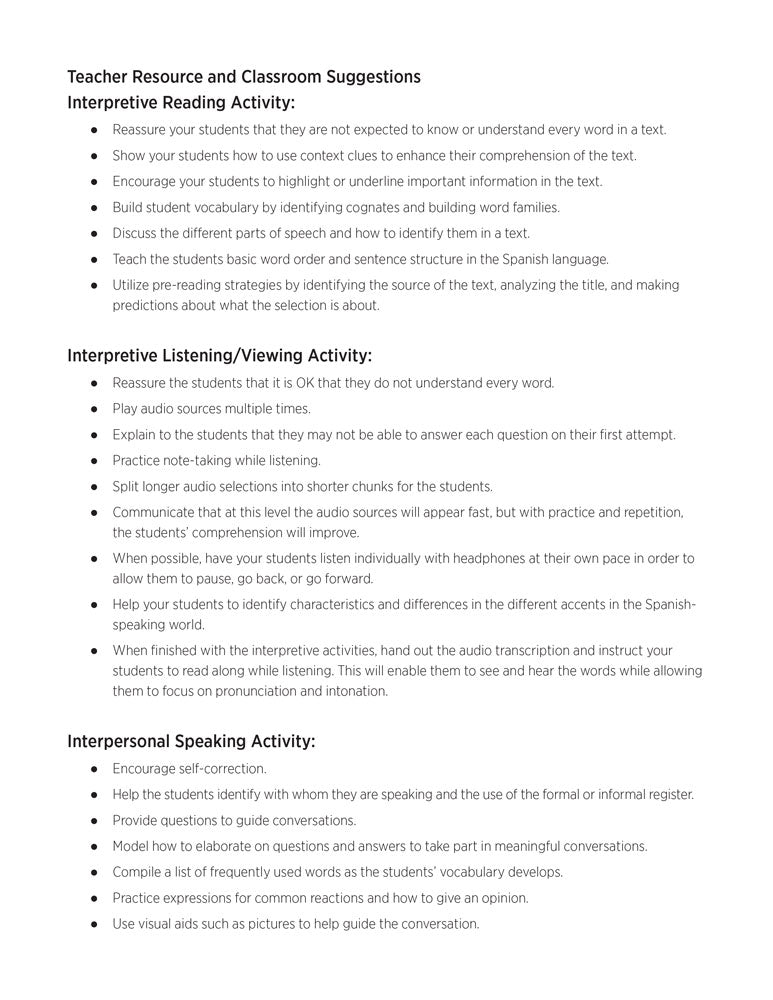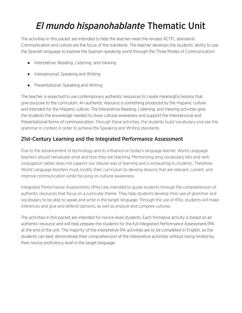 Break down the content, increase comprehension, and develop cultural awareness by analyzing the products, practices, and perspectives of contemporary Spanish-speaking world culture. Teach communication and promote language usage with this novice-level unit. Complete ready-to-use thematic unit built around authentic resources and modeled on ACTFL standards.