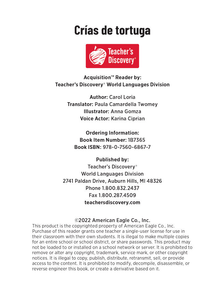 Crías de tortuga - Pre-Level 1 - Spanish Acquisition™ Reader by Carol Loria is backordered and will ship as soon as it is back in stock.