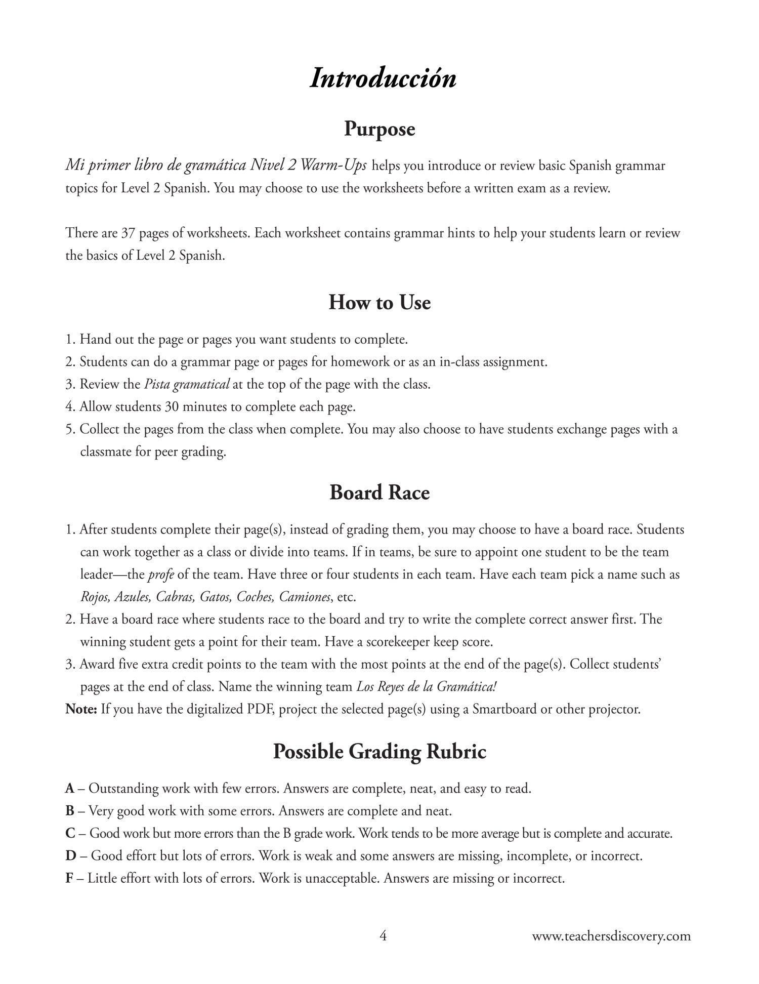 Tom Alsop has created a new book designed specifically for Level 2 Spanish students. Over 30 grammar topics explained, with exercises to accompany them. These exercises are great for individual, pair, or small group review before a test or purely to warm up the students at the start of class. Includes grammar topics using verbs with various tenses, possessive adjectives, possessive pronouns, expressions, and so much more.