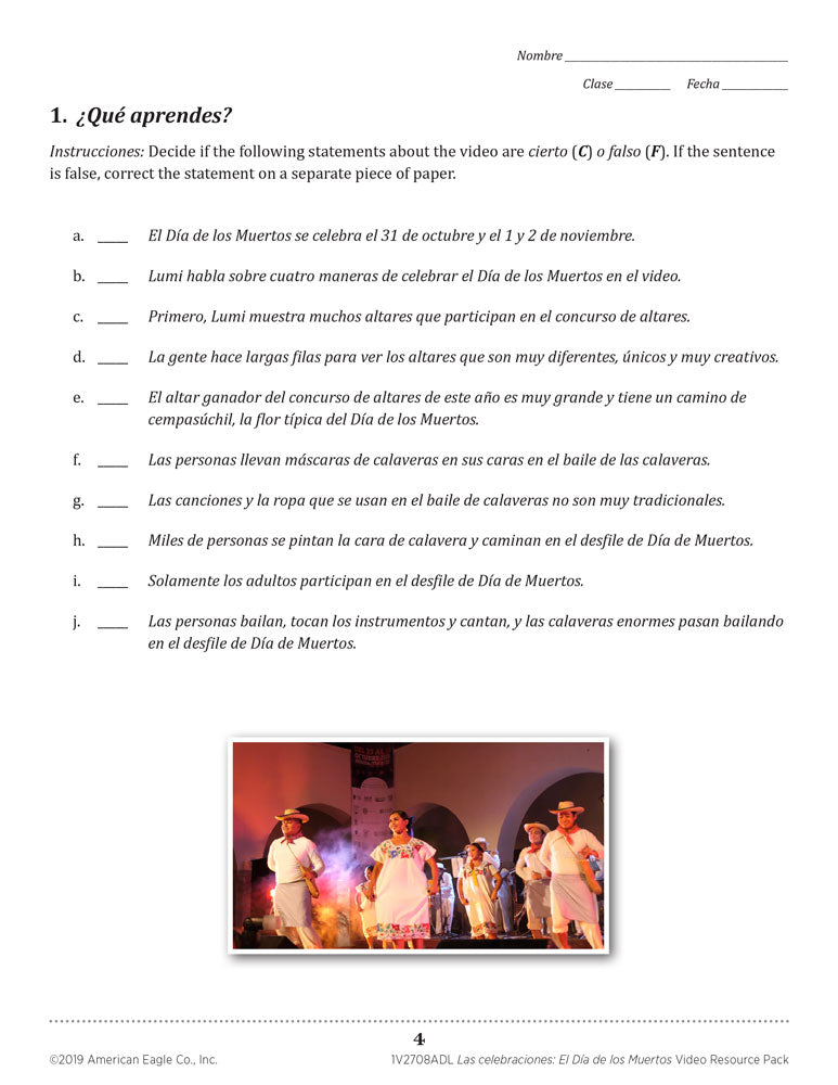 Lumi Lara, a native to Mexico, shares three of the Day of the Dead celebrations that take place in her home town of Mérida with your students. Two cultural video shorts, one in Spanish and one in English with Spanish terms, paired with a specifically created video resource guide, help to promote cultural understanding, increase student discussions, comprehension, and assess the video content. The downloadable format of both videos and resource guide gives you the flexibility to choose the appropriate level as well as from a variety of eight activities that fit your classroom teaching style, your students’ abilities, and the time constraints of your classes.