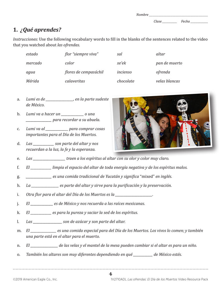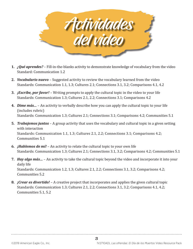Lumi Lara, a native to Mexico, brings your students along to the local market to gather and purchase items to build an ofrenda for her abuela. Two cultural video shorts, one in Spanish and one in English with Spanish terms, paired with a specifically created video resource guide, help to promote cultural understanding, increase student discussions, comprehension, and assess the video content. The downloadable format of both videos and resource guide gives you the flexibility to choose the appropriate level as well as from a variety of eight activities that fit your classroom teaching style, your students’ abilities, and the time constraints of your classes.