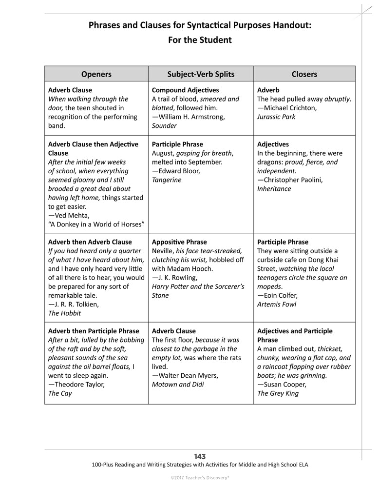 - Phrases and Clauses for Syntactical Purposes Handout: For the Student