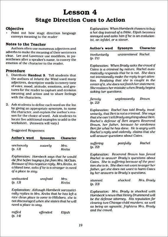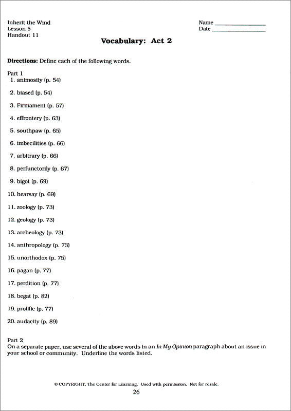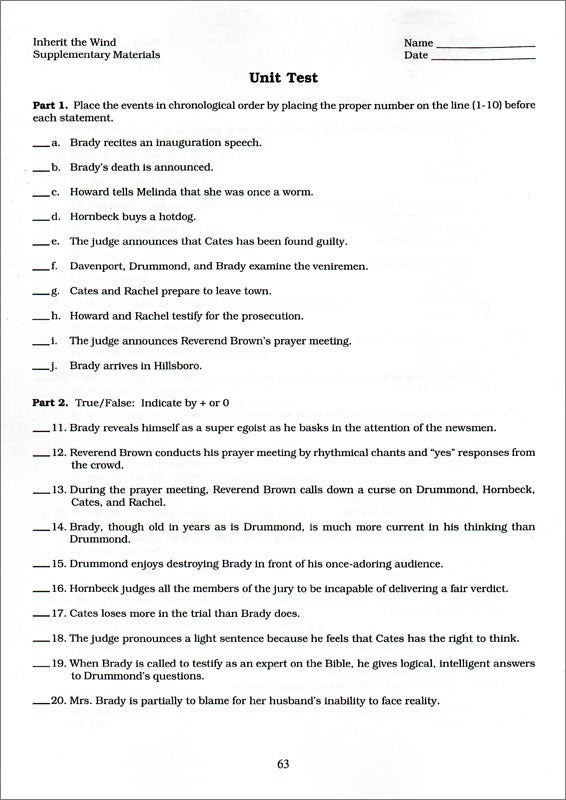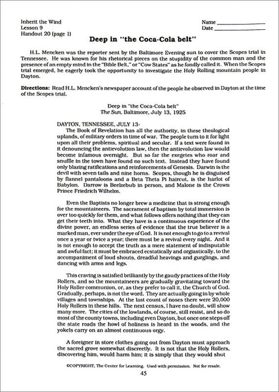 Inherit the Wind Teaching Unit ~ Book ~ 11 Lesson Plans Plus 25 Student Handouts and Activities