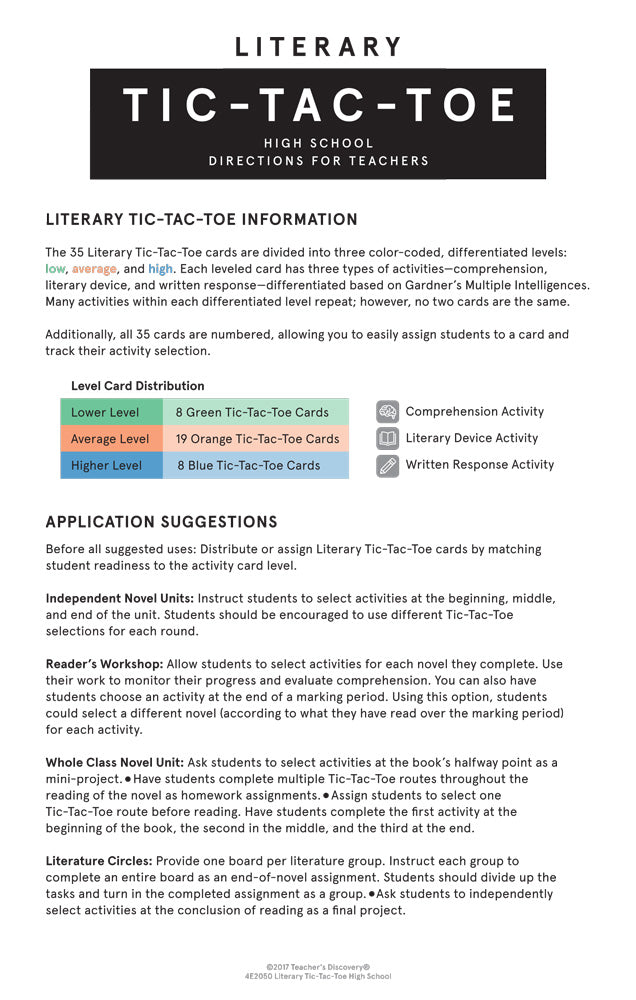 Total of 50 activities spanning 35 Literary Tic-Tac-Toe cards excite every student and work with any novel. Many activities within each differentiated level repeat, but no two cards are the same. Includes enough cards for oversized classes, as well as application suggestions for spicing up a novel unit, assessing reader's workshop, or energizing independent reading.