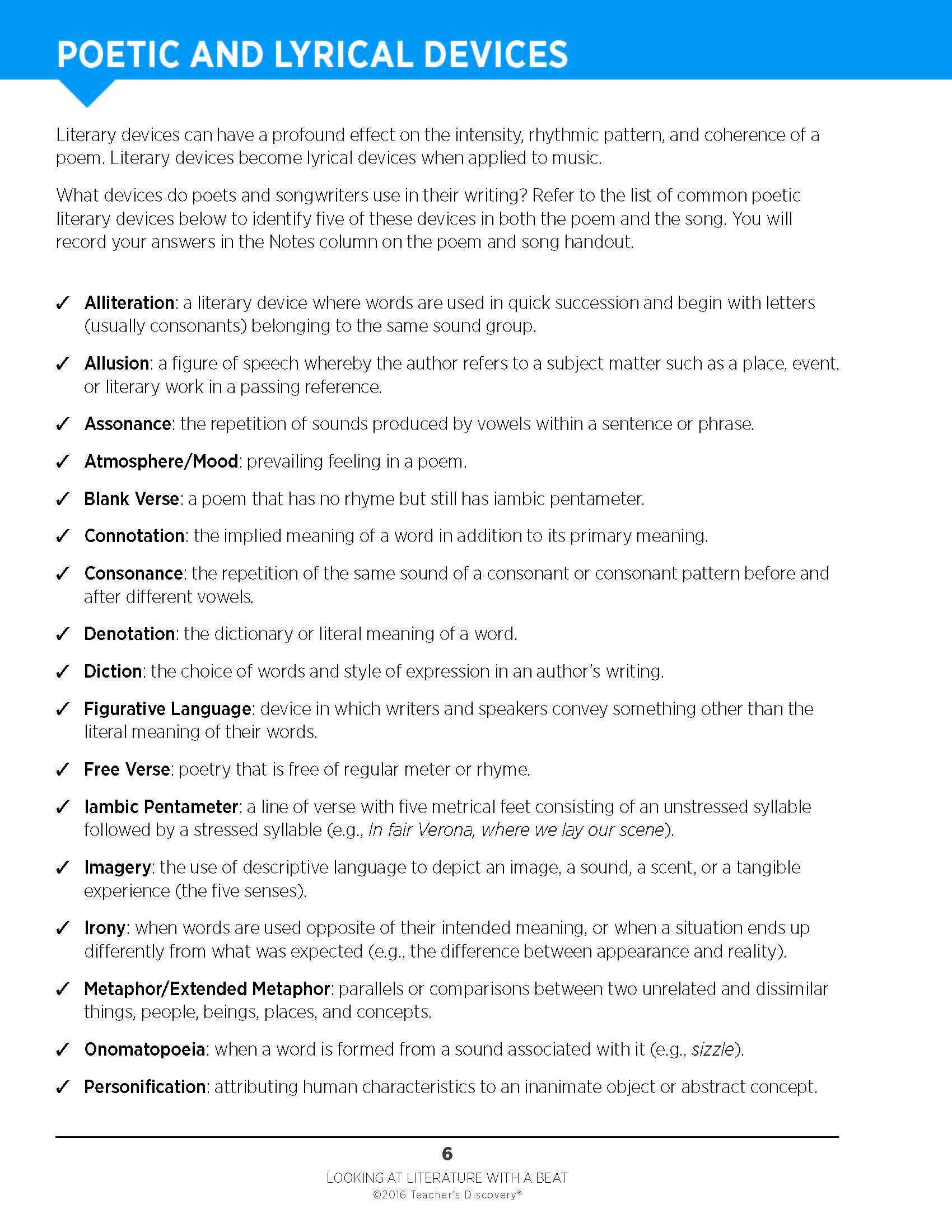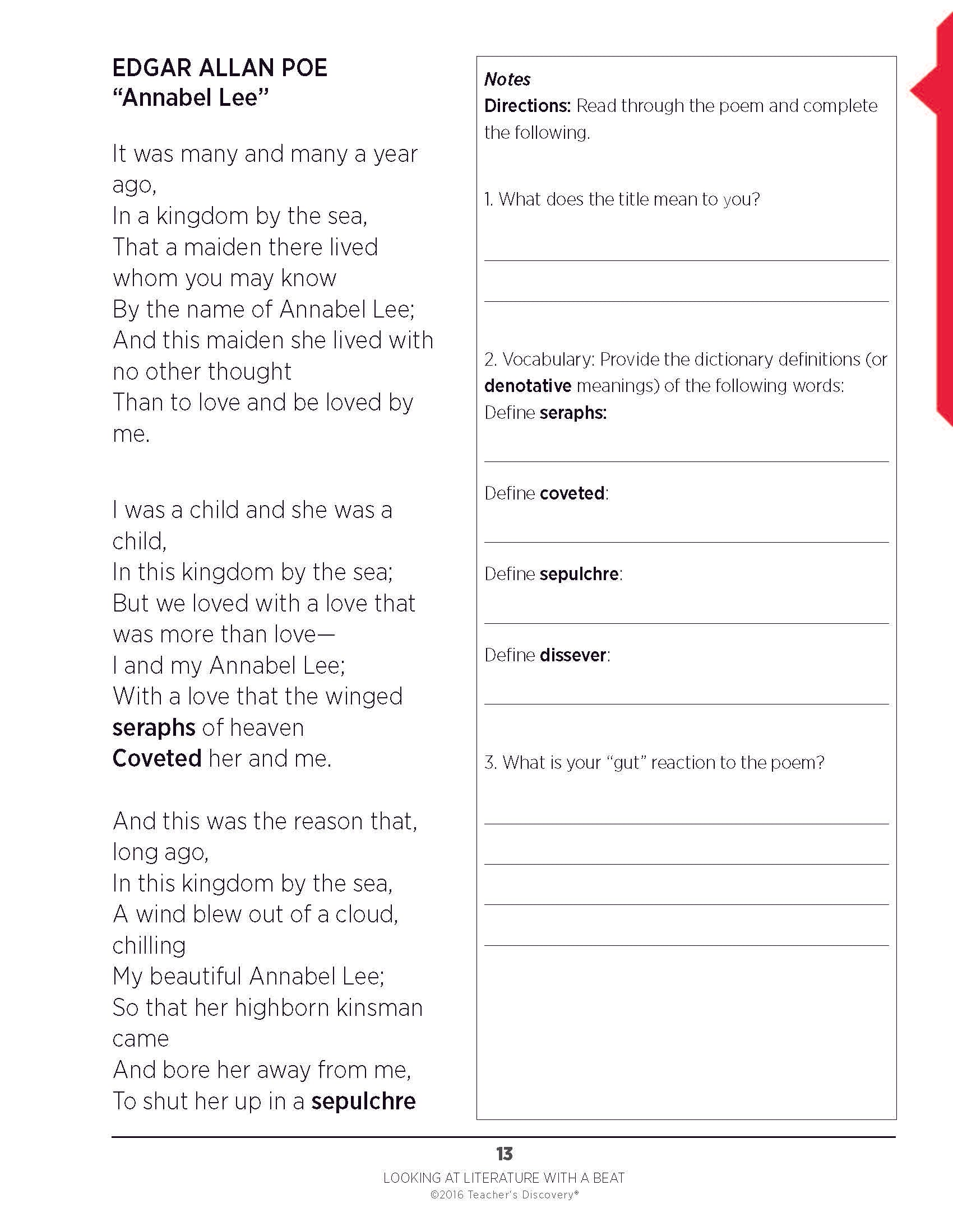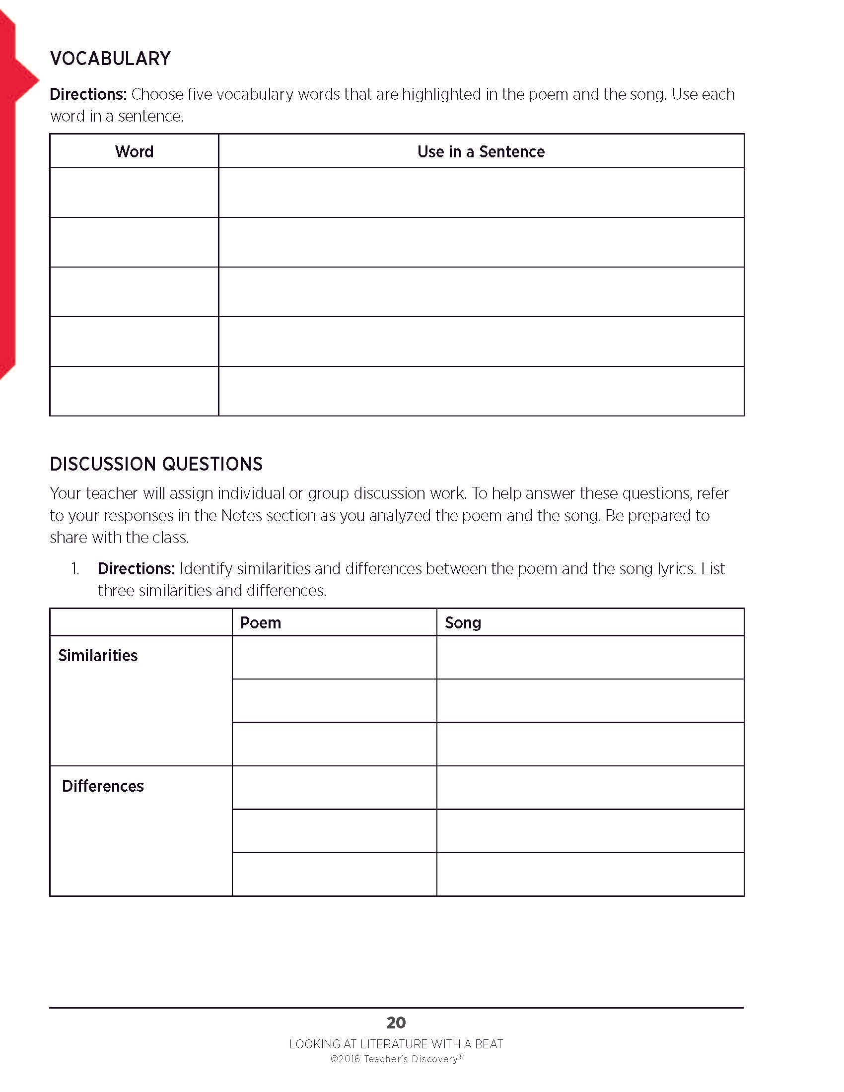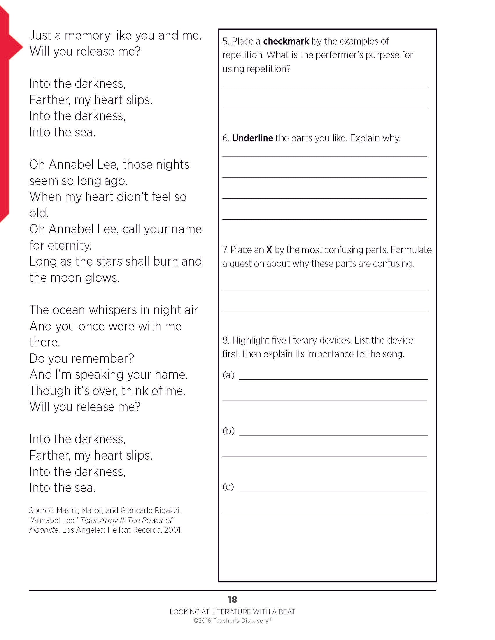 - poem and song lyrics with close-reading exercises presented in two columns. The left-hand column features the reprinted poem and song; the right-hand “Notes” column includes questions for students to answer as they work through the poem and song lyrics to uncover deeper meaning and reveal the literary techniques used in the work;