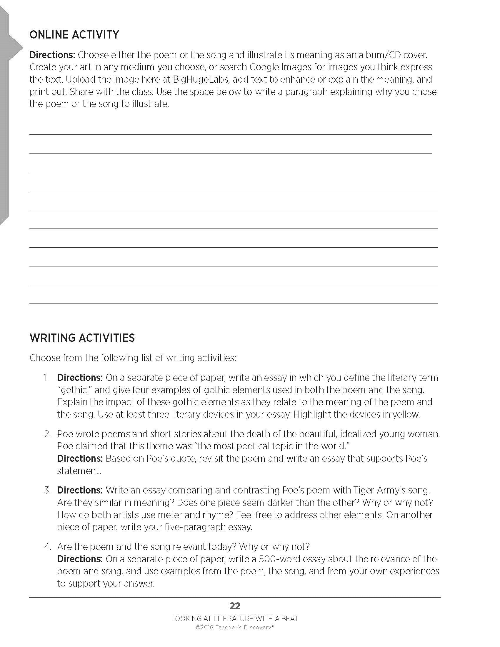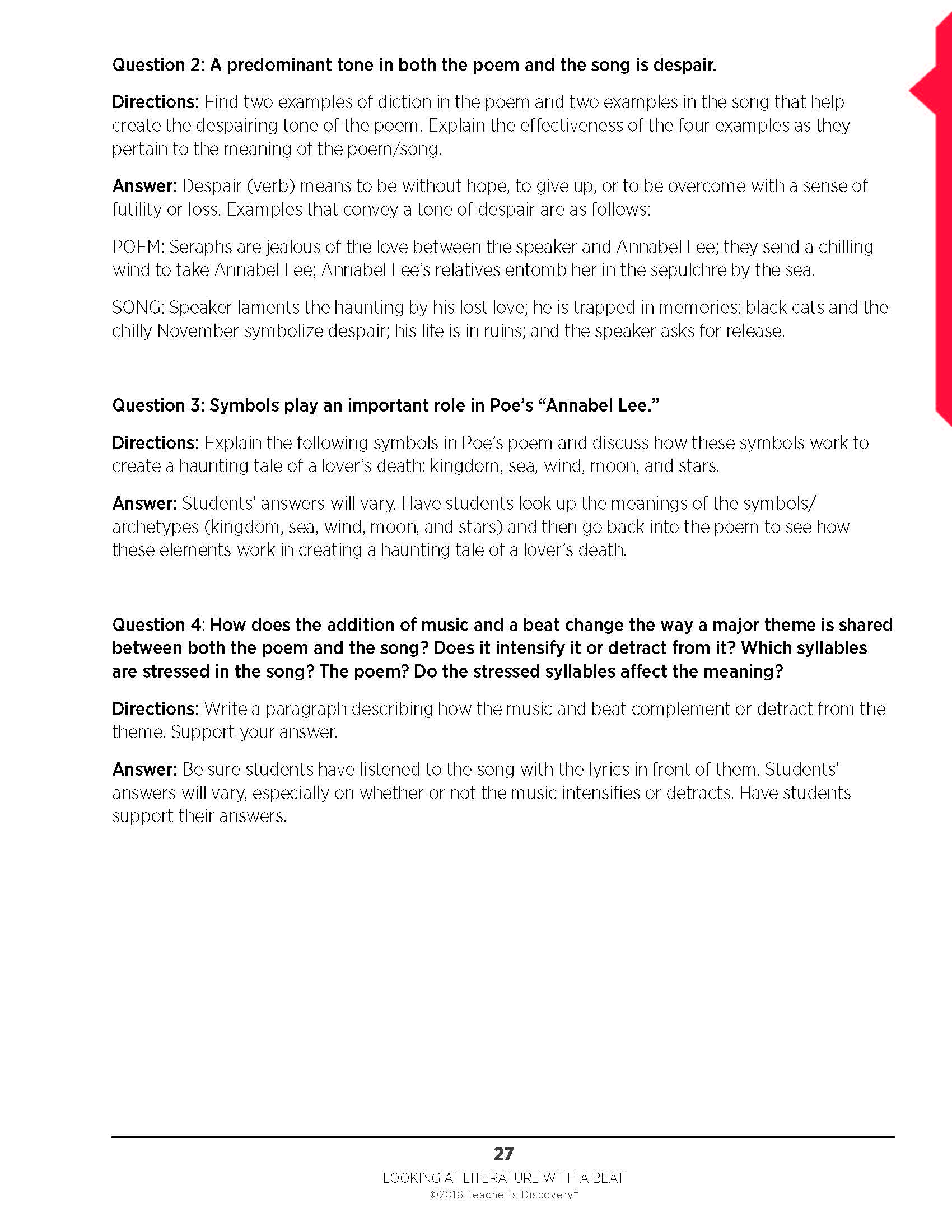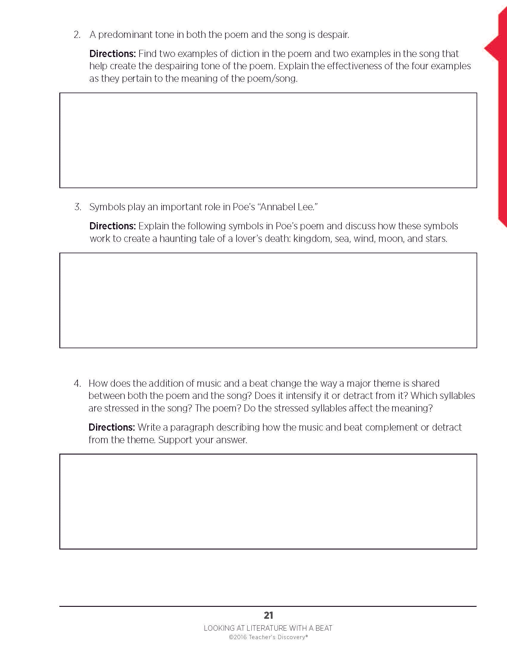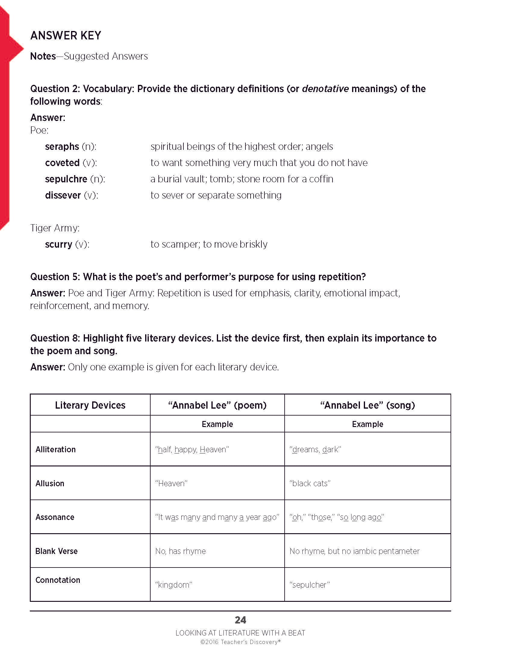 - poem and song lyrics with close-reading exercises presented in two columns. The left-hand column features the reprinted poem and song; the right-hand “Notes” column includes questions for students to answer as they work through the poem and song lyrics to uncover deeper meaning and reveal the literary techniques used in the work;
