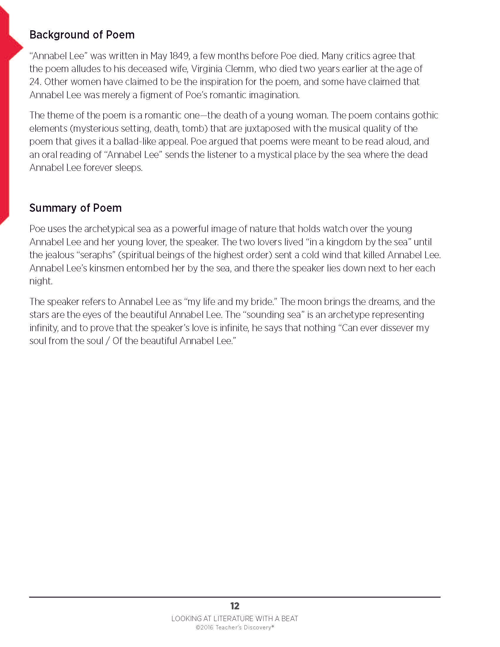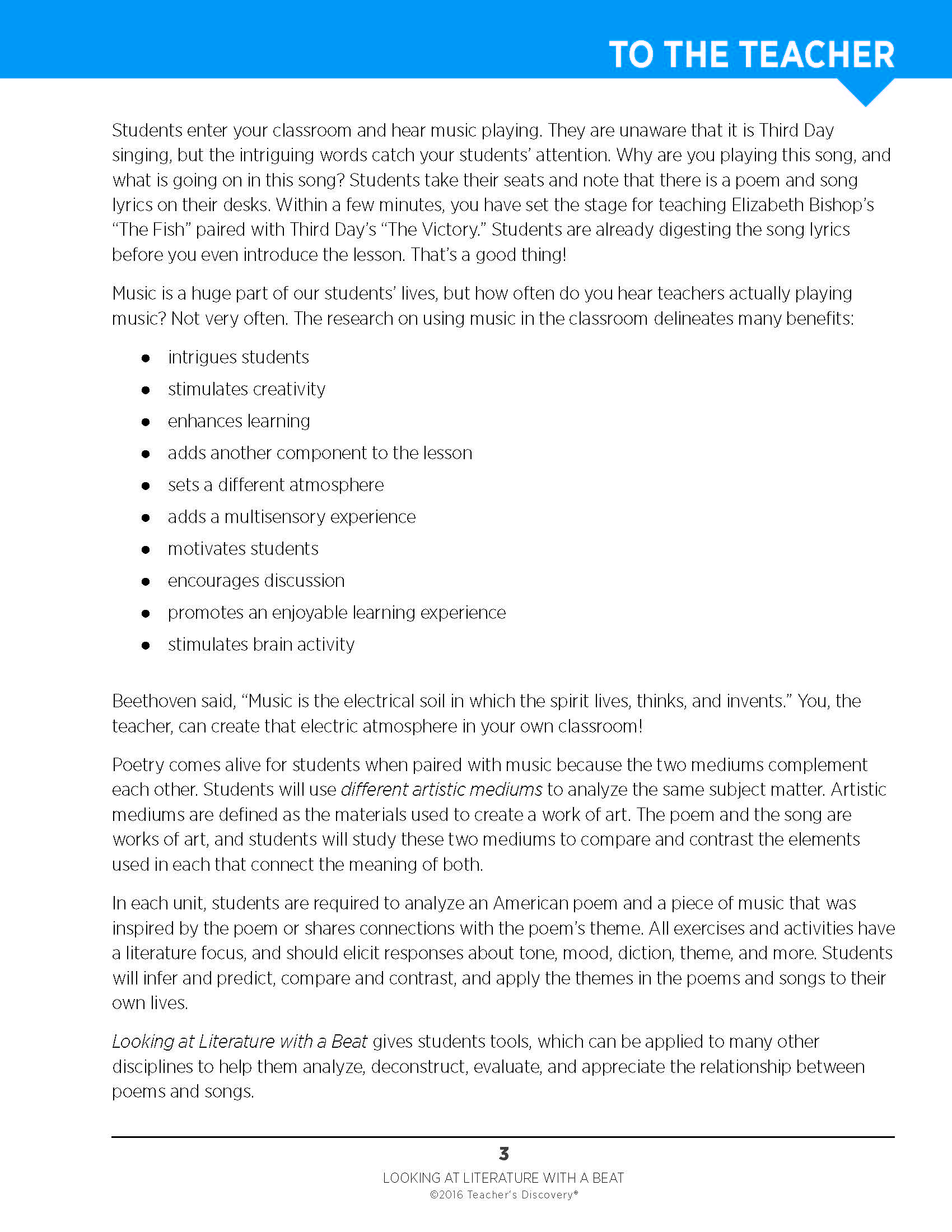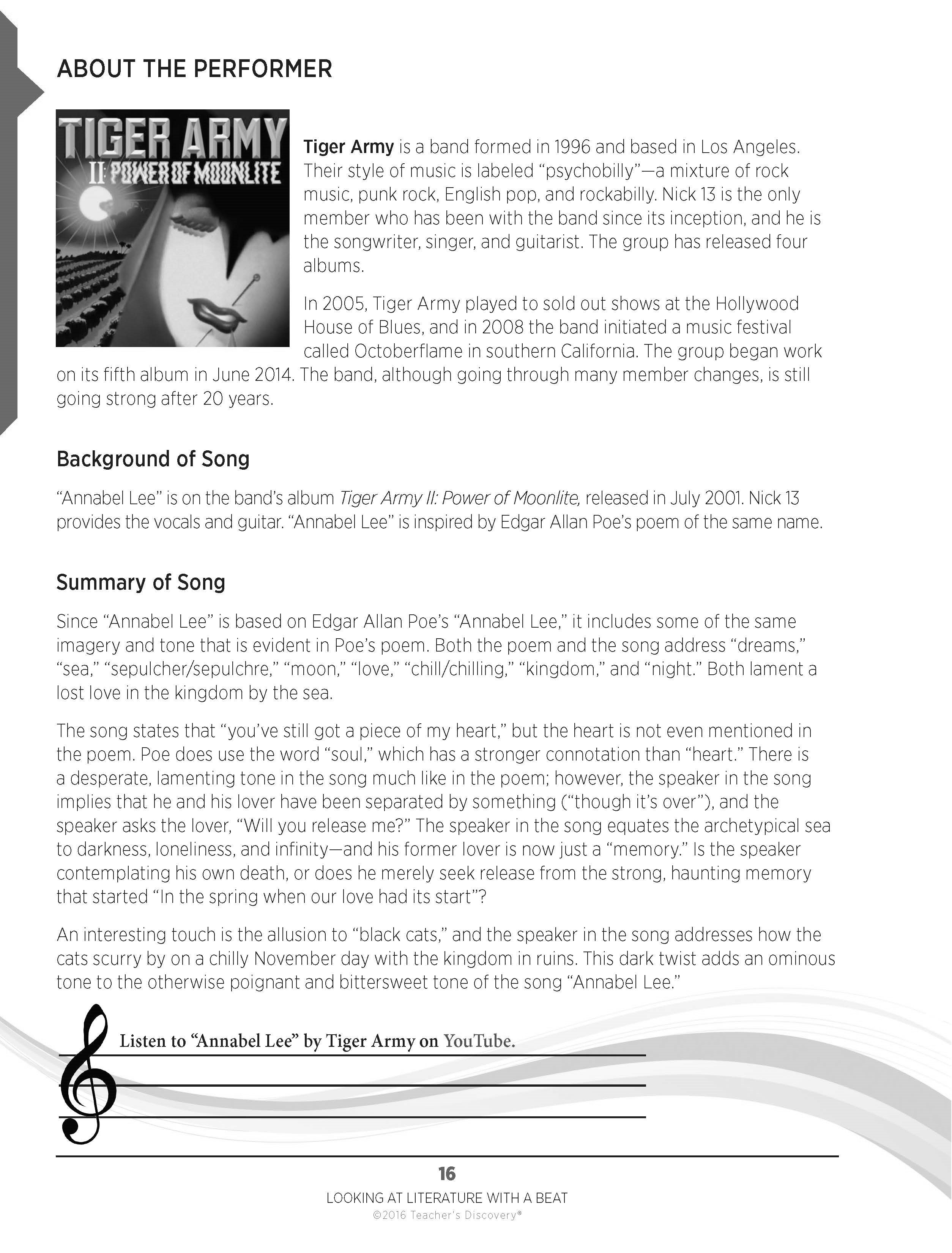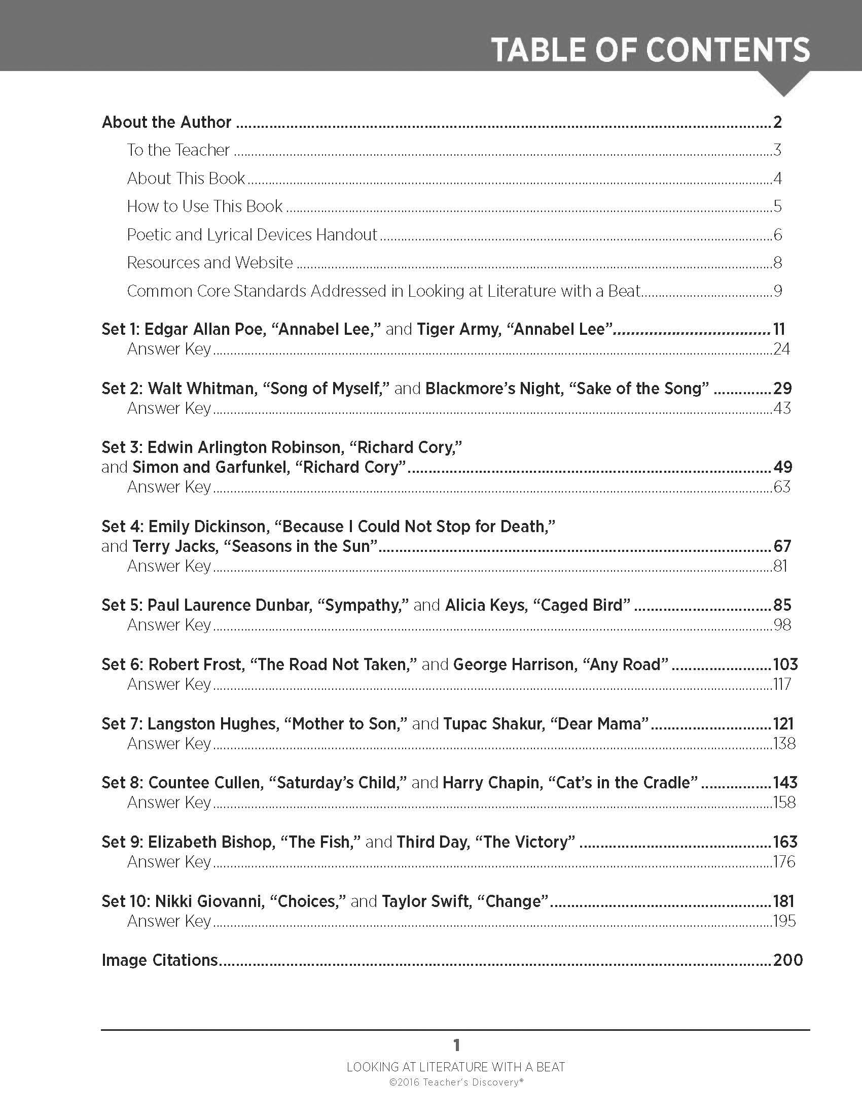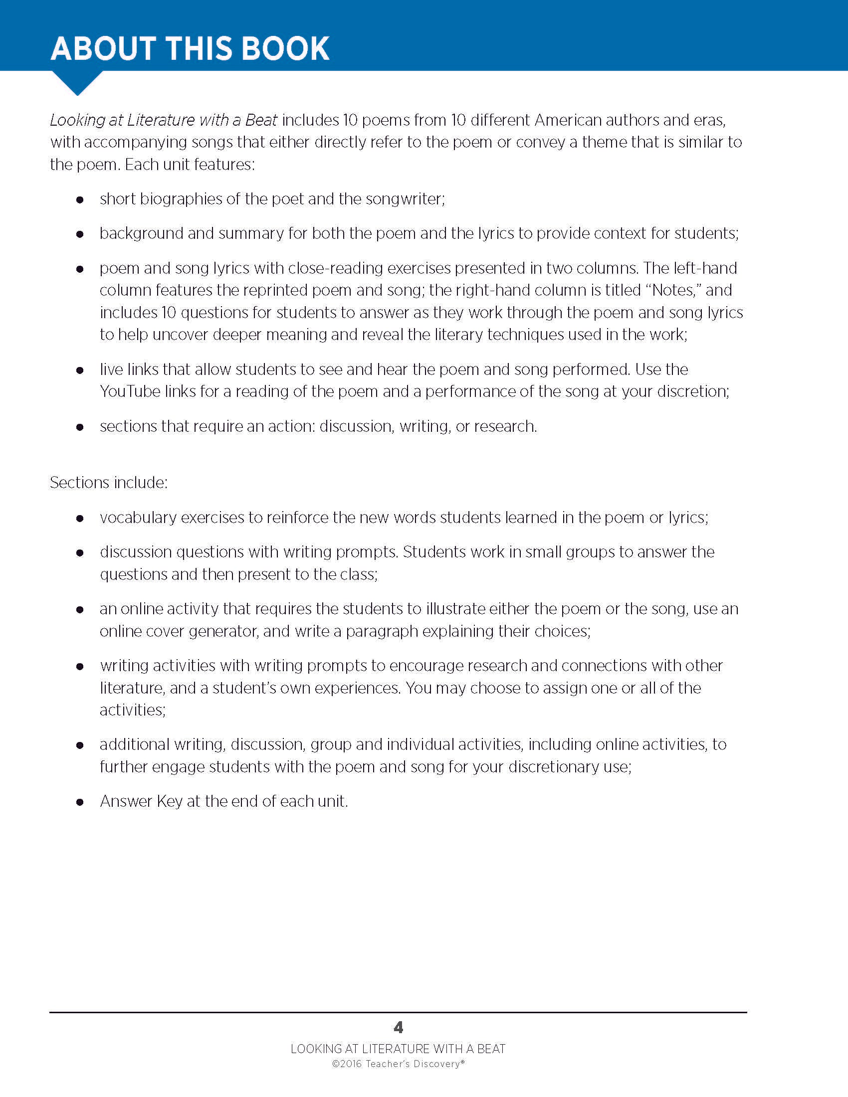 Looking at Literature with a Beat includes 10 poems from 10 American authors and eras, with accompanying songs that either directly refer to the poem or convey a theme that is similar to the poem.