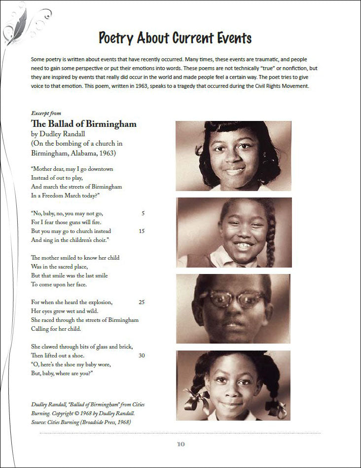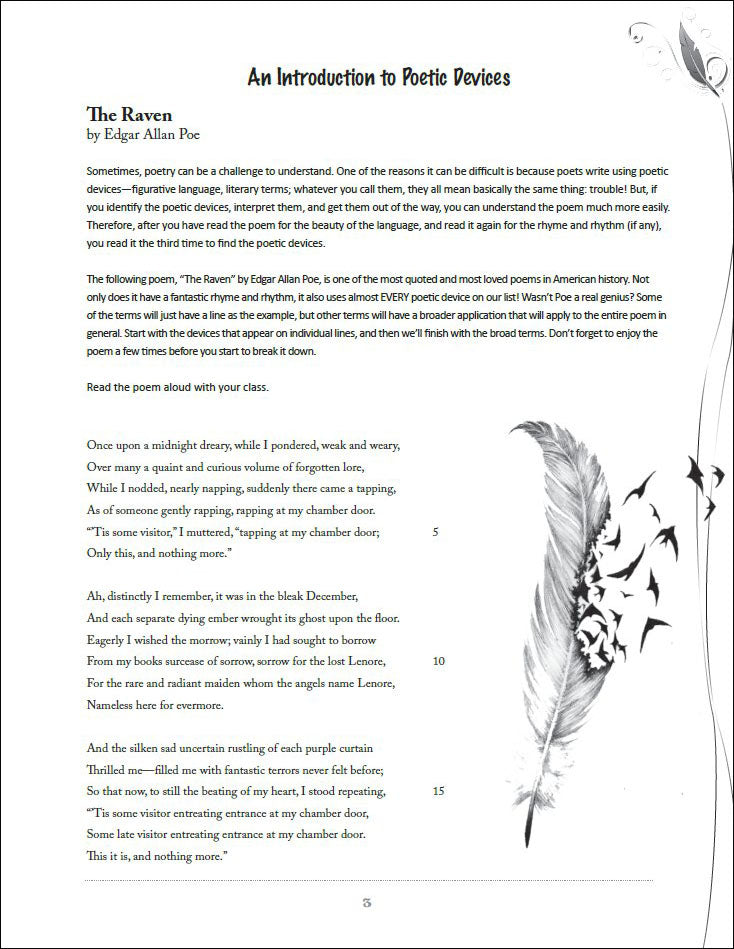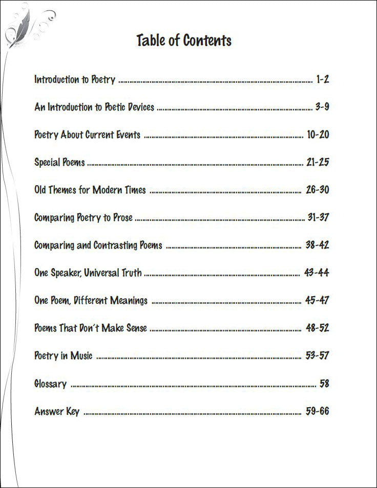 Teach your students poetry using the close reading concept of having the student read and re-read the poems again and again. They learn to scrutinize every word, every phrase, and every sentence that could convey deeper meanings. Students learn to compare and contrast poems to other kinds of fiction and to nonfiction. The lessons ask them to write paragraph answers and longer, essay-style responses. In order to understand poetry, students need to know about poetic devices. These devices are covered in the lessons, and a glossary is included at the end of the book. The book also includes a fun section on poetry in music that your students will love! Includes an answer key of suggested responses.