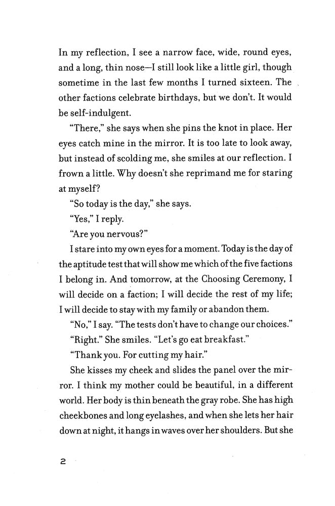 First of the Divergent trilogy, a series of young adult dystopian. Features a post-apocalyptic version of Chicago and follows Beatrice "Tris" Prior as she explores her identity within a society that defines its citizens by their social and personality-related affiliation with five factions, which removes the threat of anyone exercising independent will and re-threatening the population's safety. Underlying the action and dystopian focused main plot is a romantic subplot between Tris and one of her instructors, nicknamed Four.