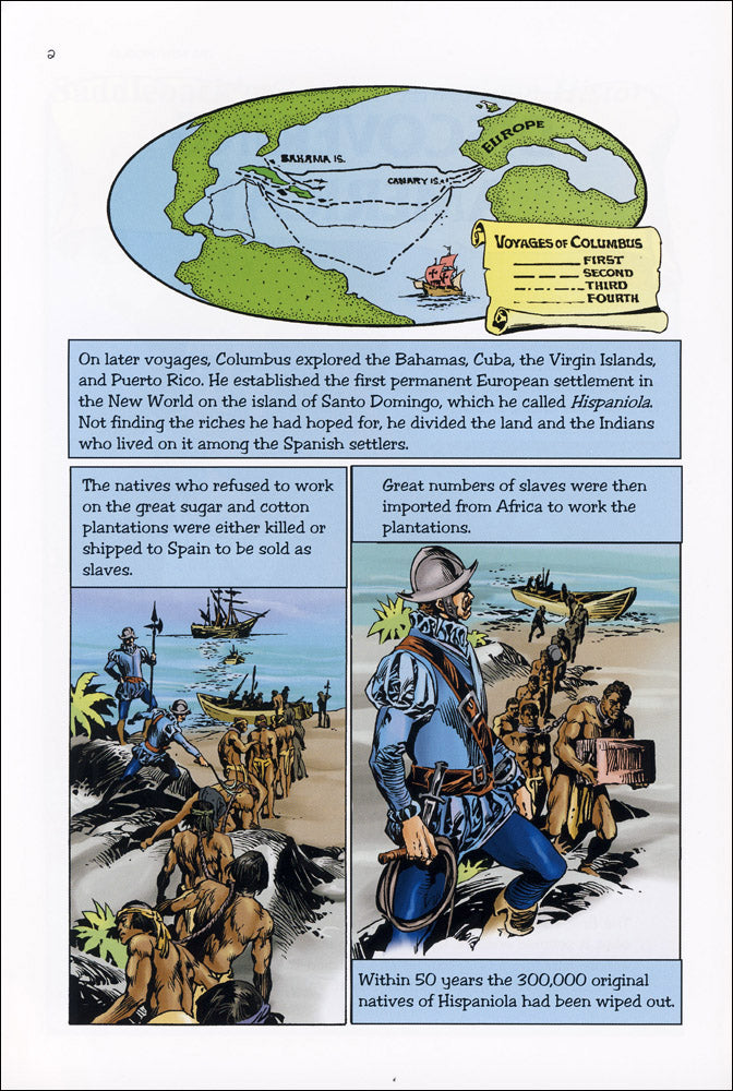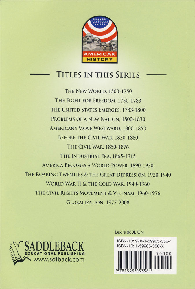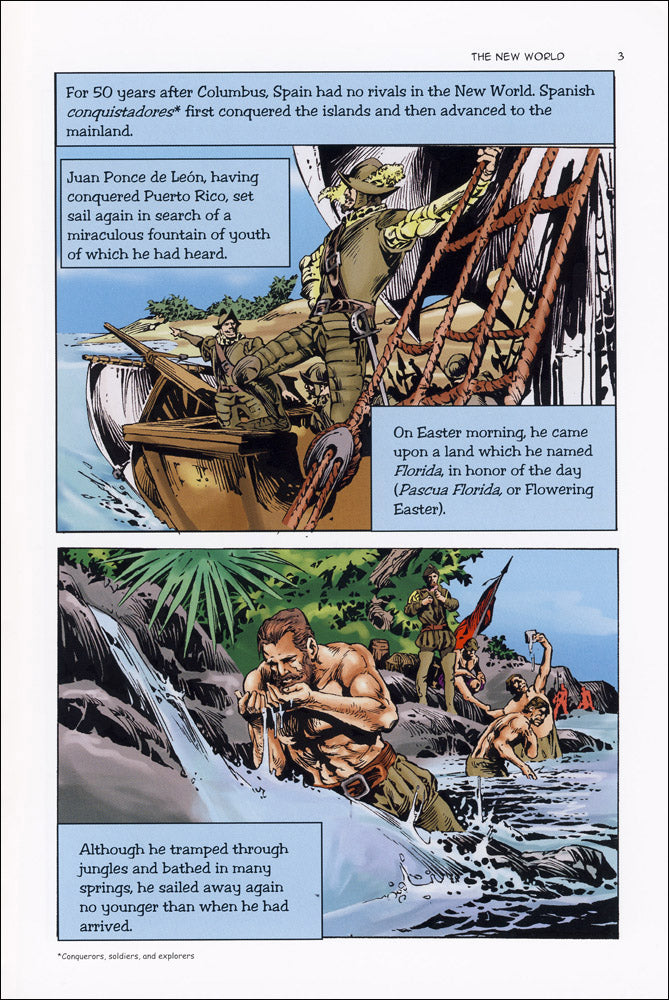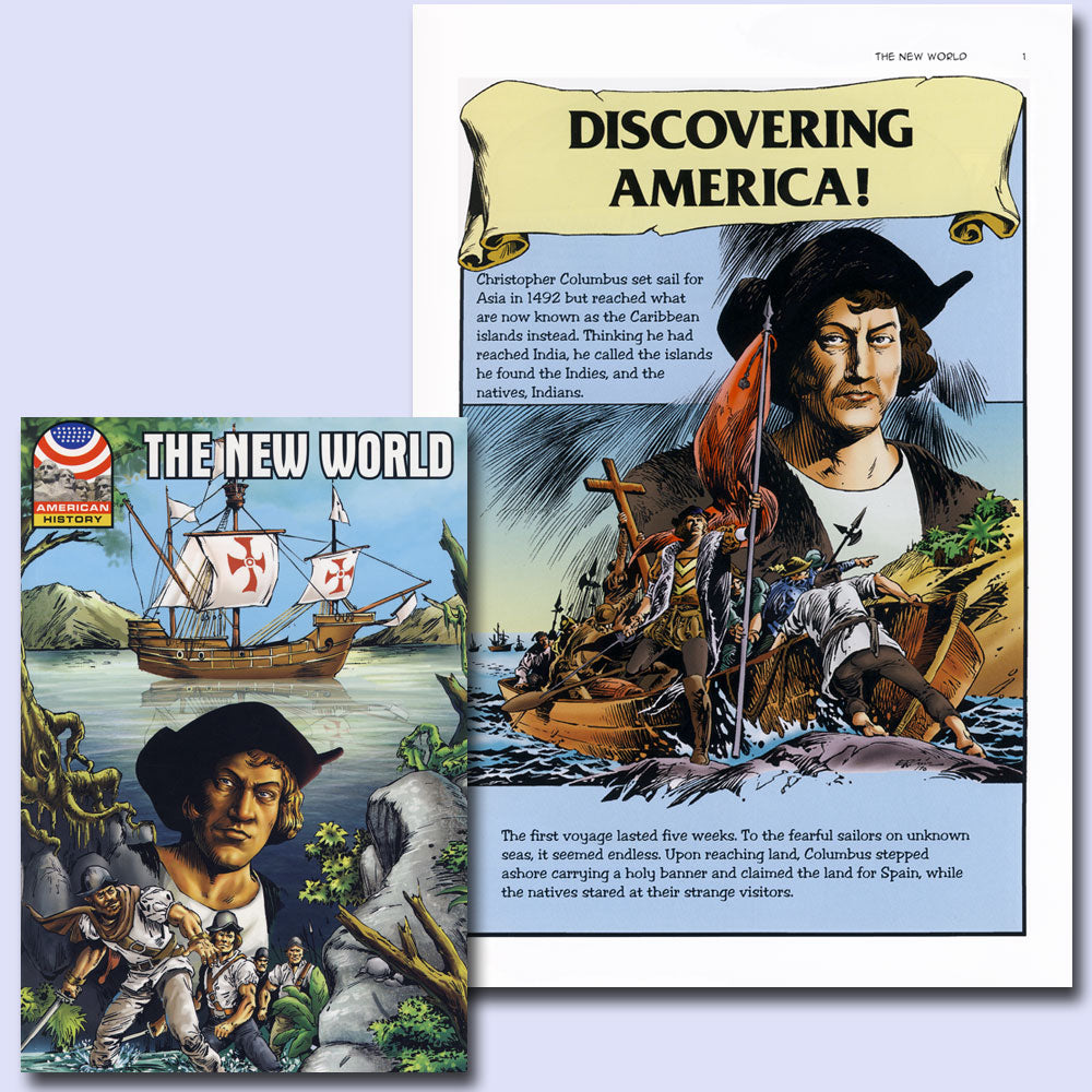 History is a story. See it brought to life in this graphic narrative beginning with the Spanish conquistadores and spanning across Captain Smith’s dealings with the Native Americans, the drafting of the Mayflower Compact, and the separation of church and state. Your students will experience the period through realistic renderings of famous historical figures, including Hernando de Soto, Robert La Salle, and General James Oglethorpe. Natural dialogue along with narrative text provides readers two simultaneous yet different perspectives of pivotal events in American history.