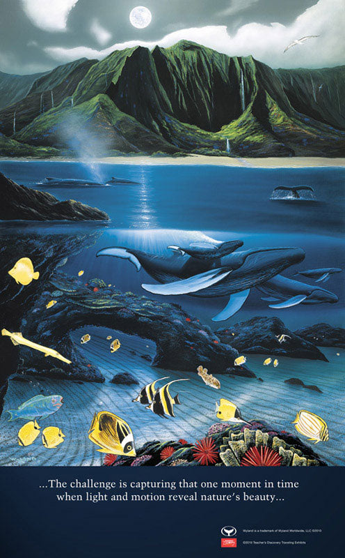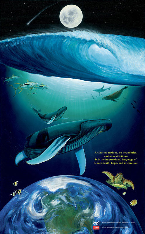 Dive into Art and Conservation with marine life artist Wyland! Wyland is a contemporary artist with a message. His paintings take you under the sea and the message about water is clear: protect our precious resource! This exhibit is a cross-curricular dream! The exhibit features 4 of Wyland's most captivating paintings and reinforces the importance of water conservation. One hanging panel (12 feet x 5.5 feet) and 3 smaller panels (each 4 feet x 6.5 feet) are easy to use and spectacular to view. The large panel is designed to be hung from a drop ceiling and the smaller panels hang on a wall with provided wall hooks and adhesives