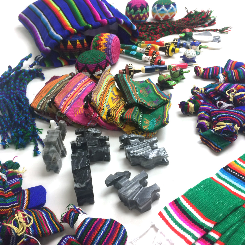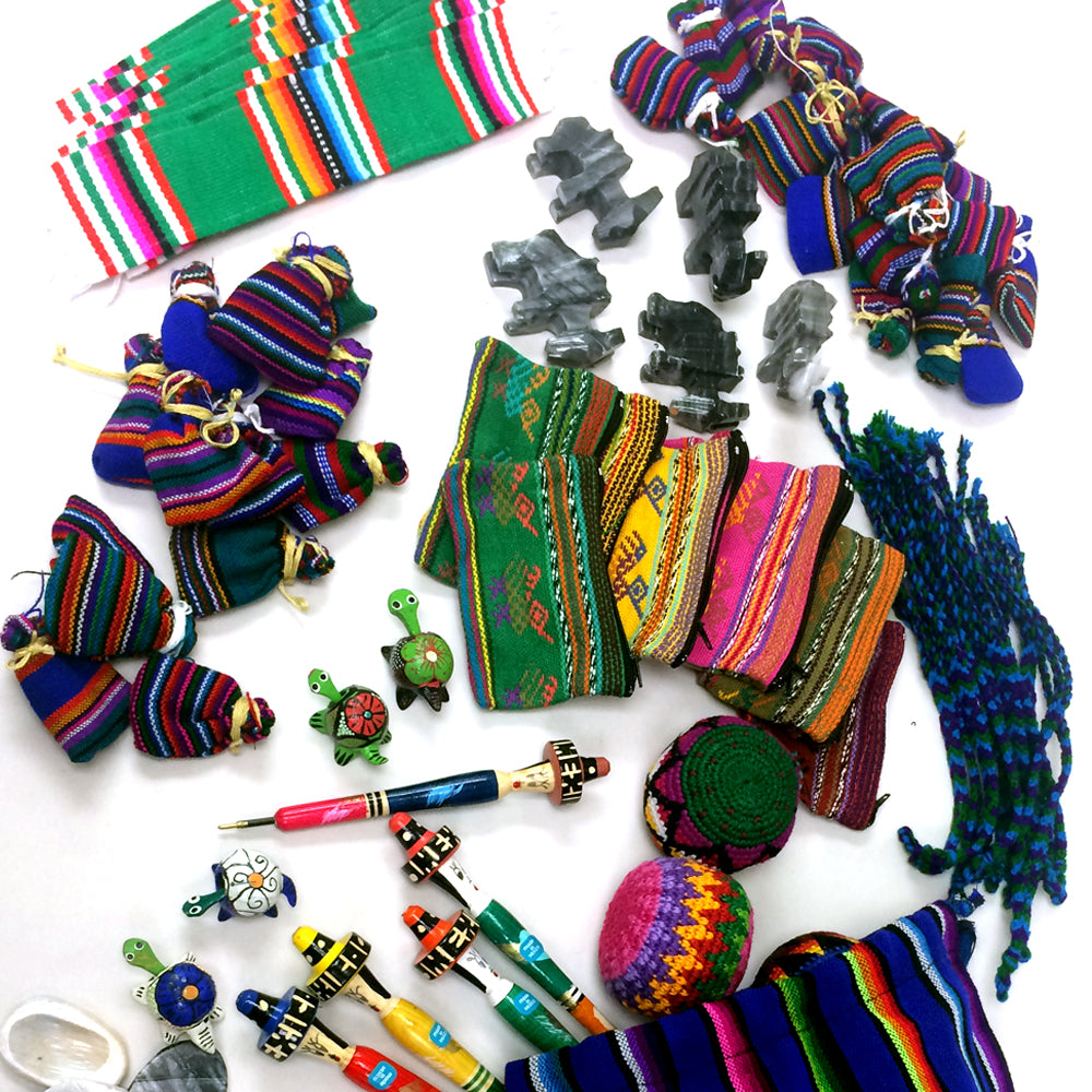 This prize bag contains a variety of authentic handicrafts from Mexico and Guatemala. Each bag contains a minimum of 100 authentic pieces in a woven Mexican shoulder bag.