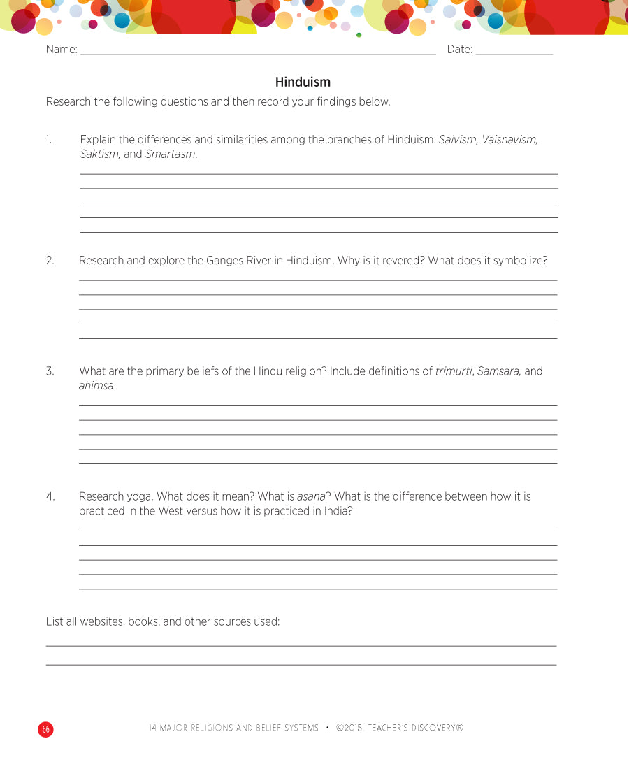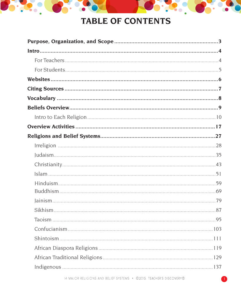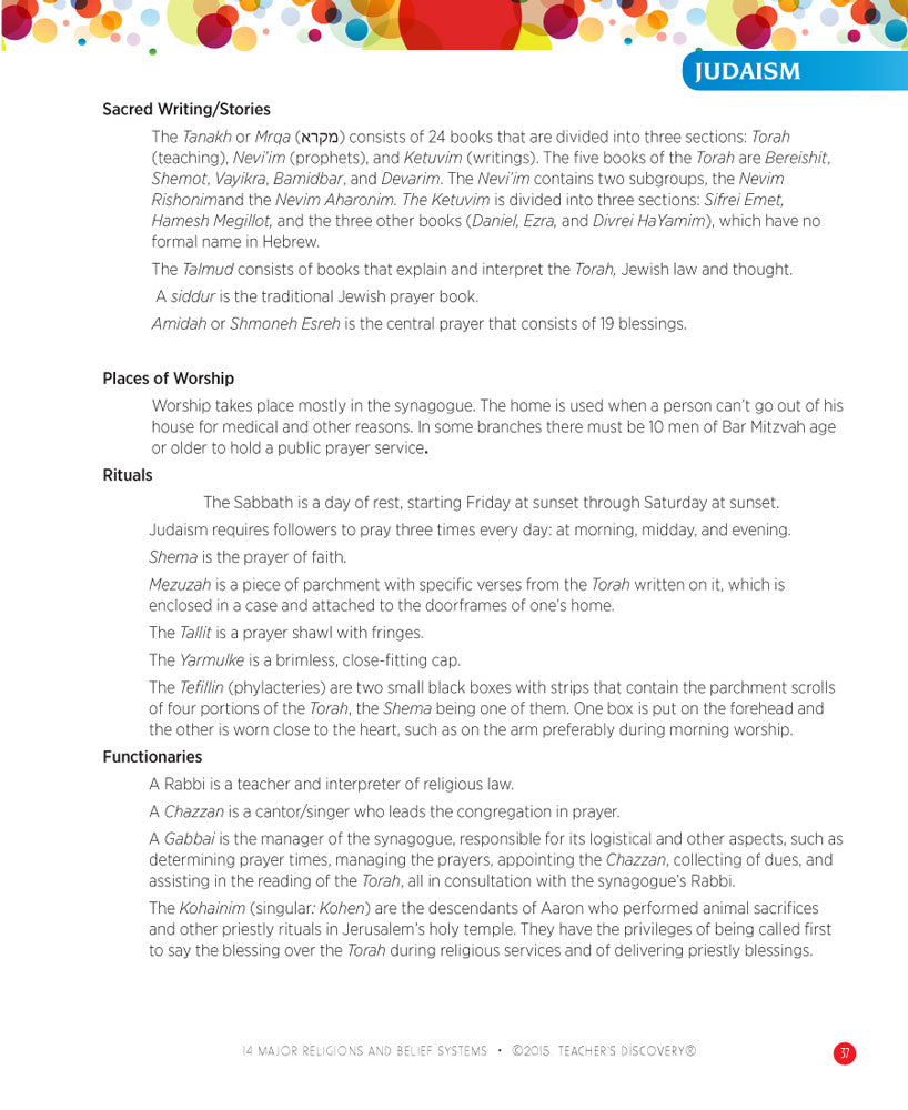 Your students will discover the traditions, rituals, and basic concepts of African Diaspora religions, African Traditional religions, Buddhism, Christianity, Confucianism, Hinduism, Indigenous beliefs, Irreligion, Islam, Jainism, Judaism, Shintoism, Sikhism, and Taoism. Bring your students to a higher understanding of world religions, and bring your classroom together with collaborative discussions. Includes reproducible activity worksheets.