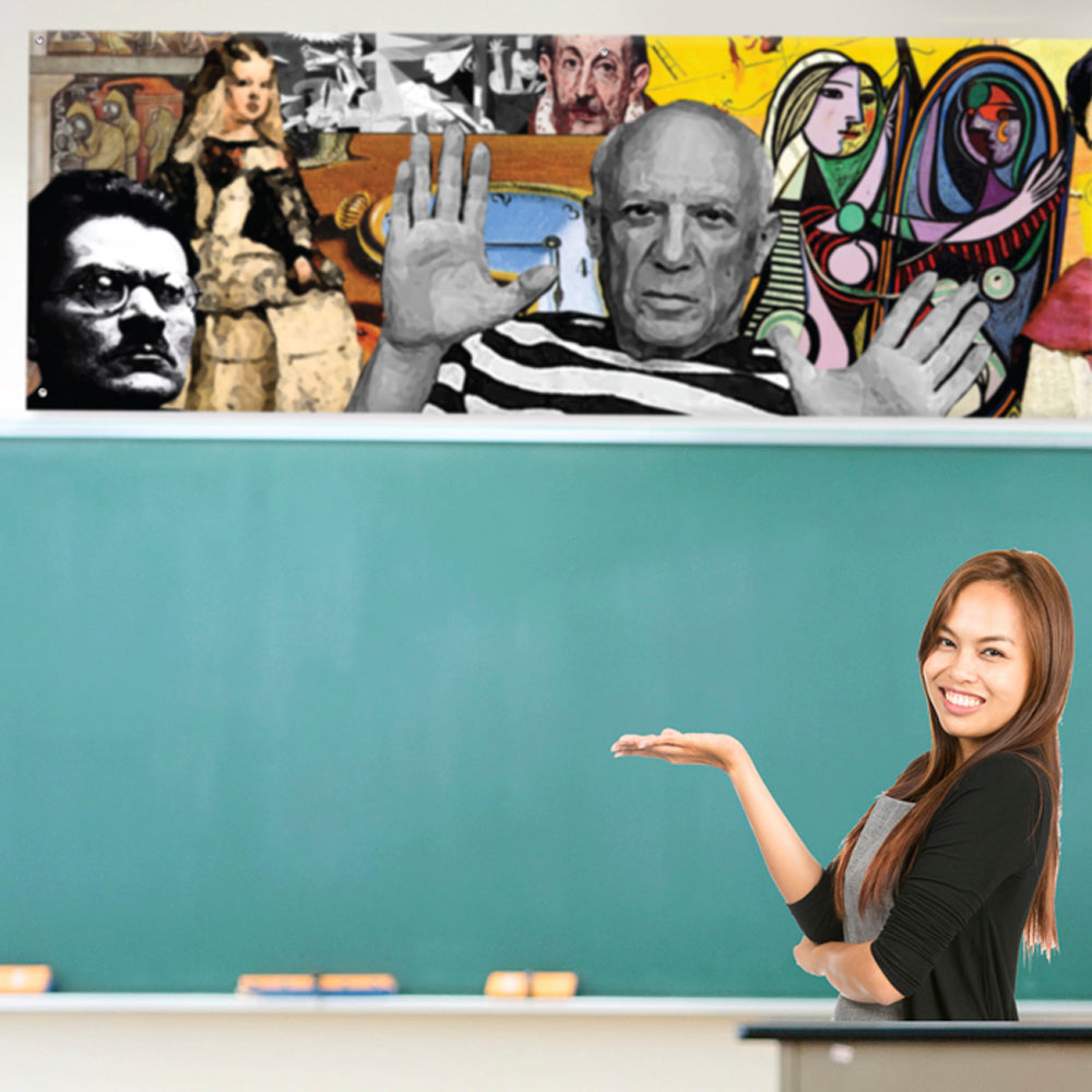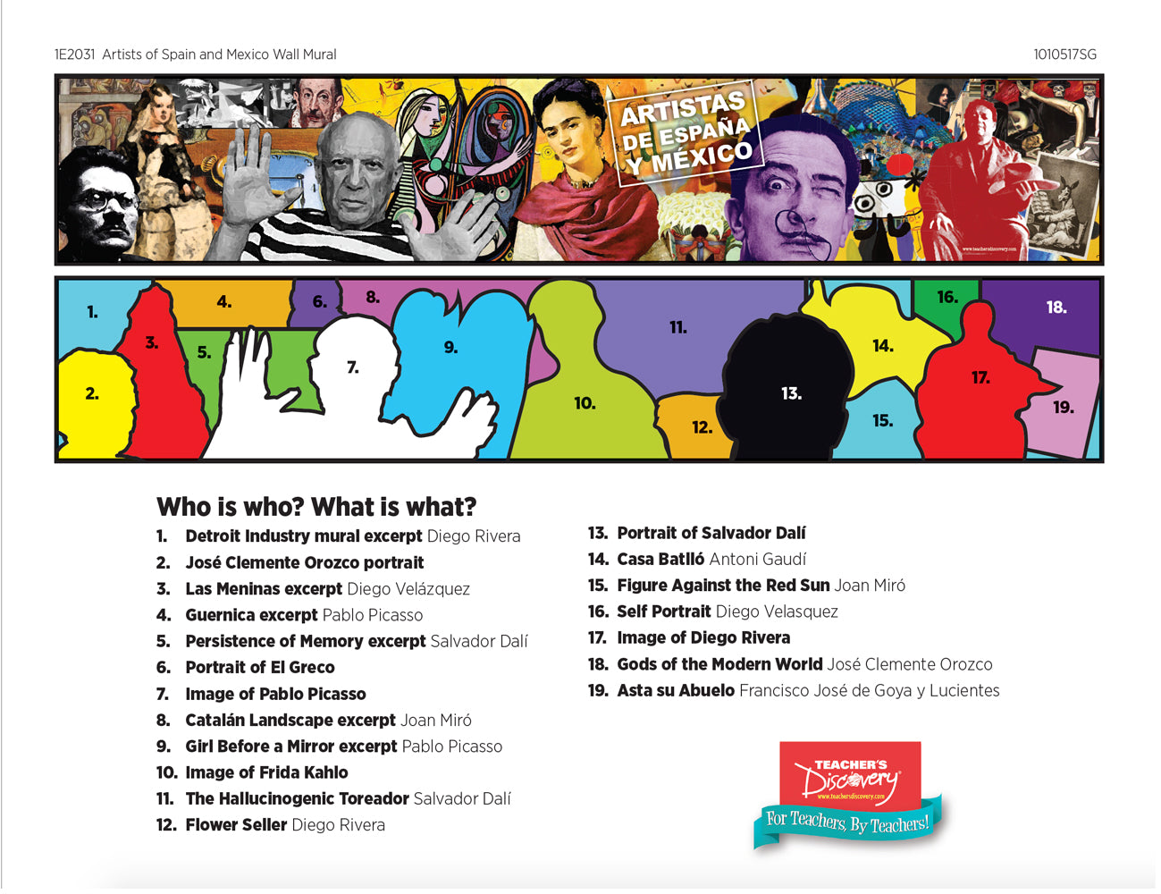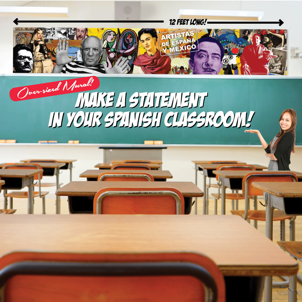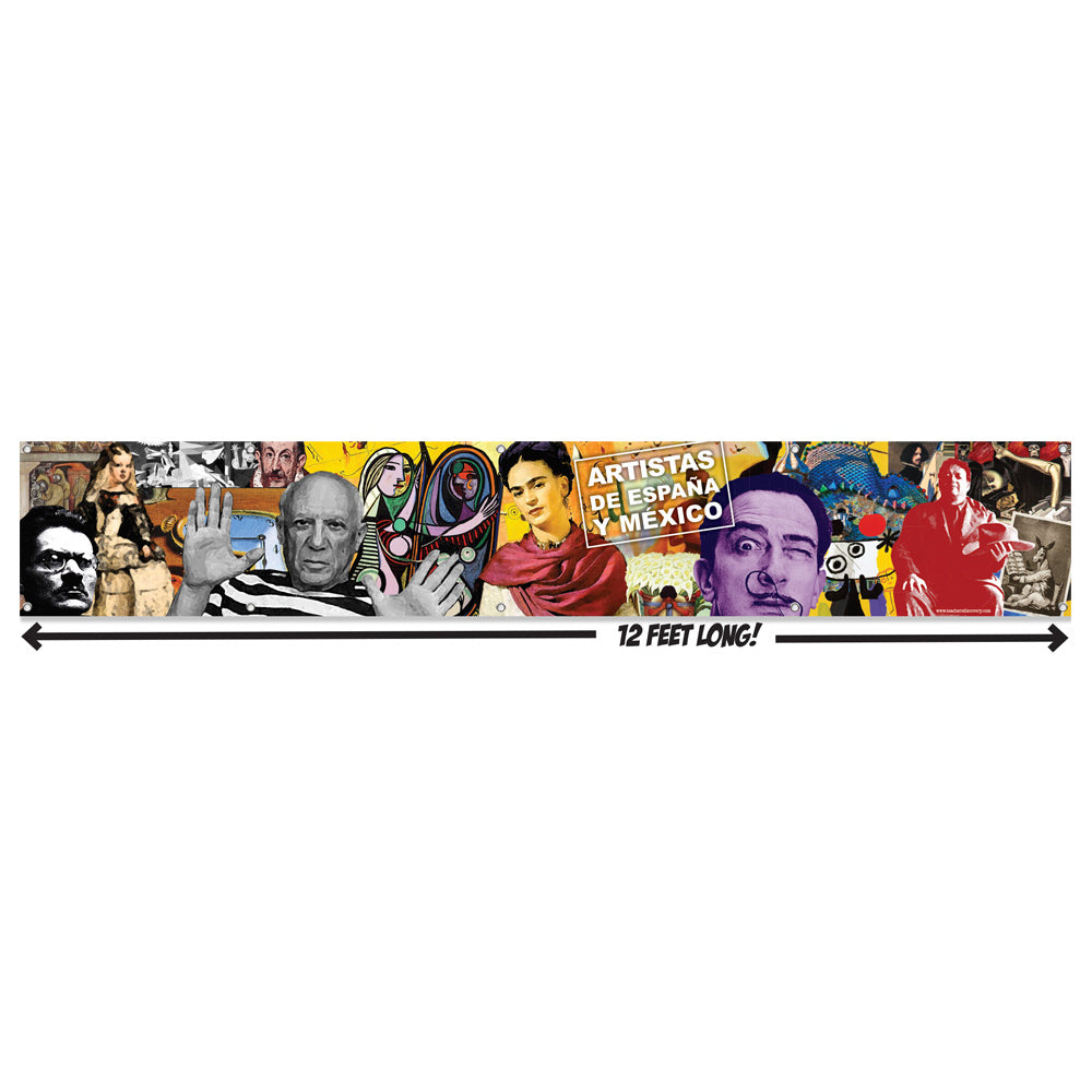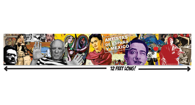 Over 12 feet long, this durable vinyl banner contains pieces of art from the most popular artists from Mexico and Spain. Vivid, colorful and fun, your classroom will have many teachable moments for students to admire all year long. 12 feet long by two feet high, thick vinyl with grommets for easy hanging. Have cinderblock? Don't worry. Doublesided tape works just as well (not included).