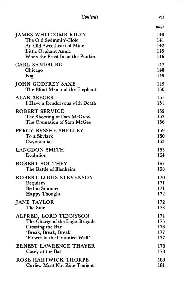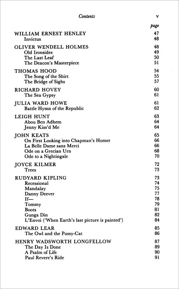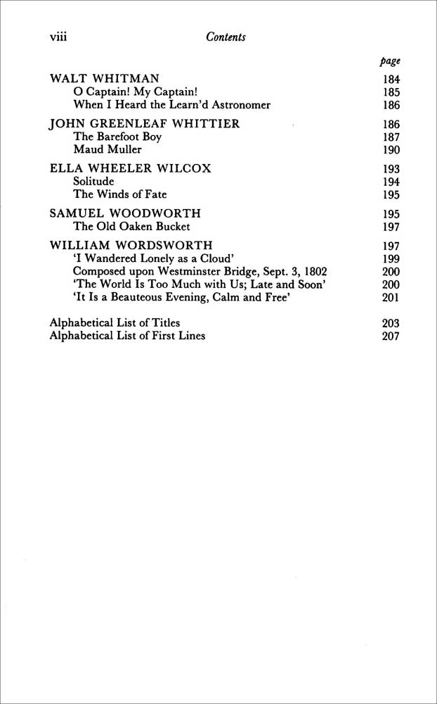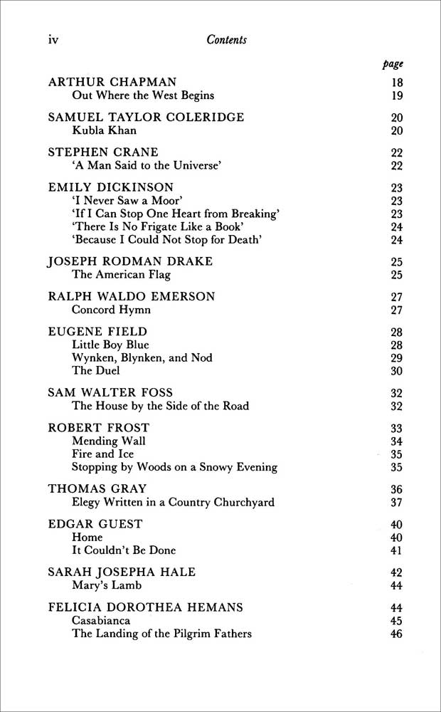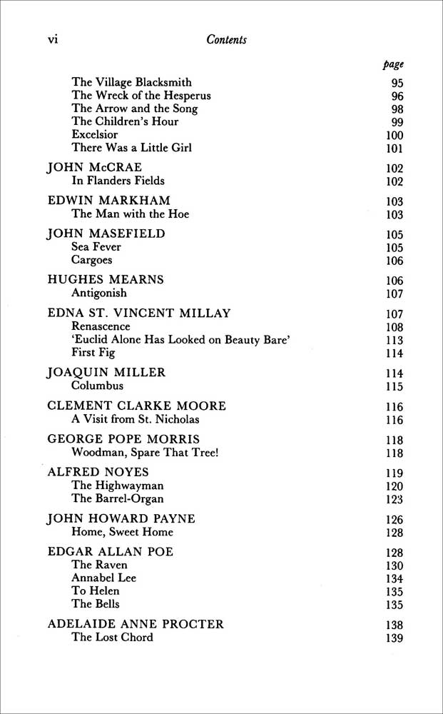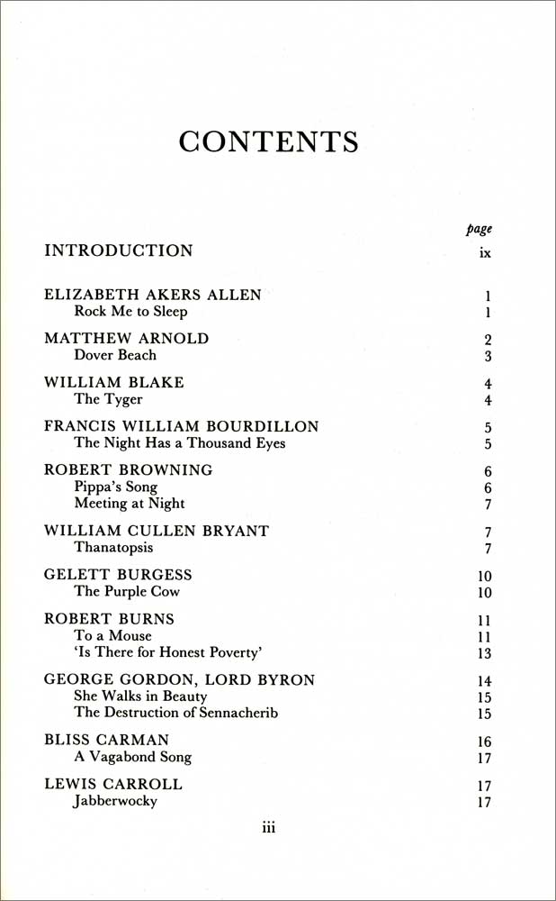 The 126 poems in this collection of 19th- and 20th-century British and American verse range from Edna St. Vincent Millay’s, "Renascence" and Edward Lear’s, "The Owl and the Pussy-Cat," to James Whitcomb Riley’s, "When the Frost is on the Punkin." Famous poets such as Wordsworth, Tennyson, Whitman, and Frost are well represented, as are less well-known poets and poems, such as John McCrae’s "In Flanders Fields" and Ernest Thayer’s "Casey at the Bat."