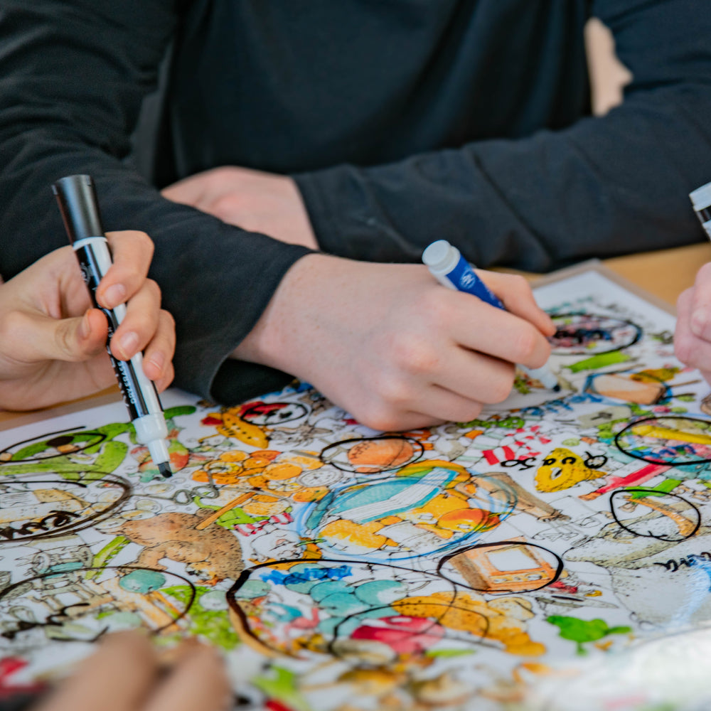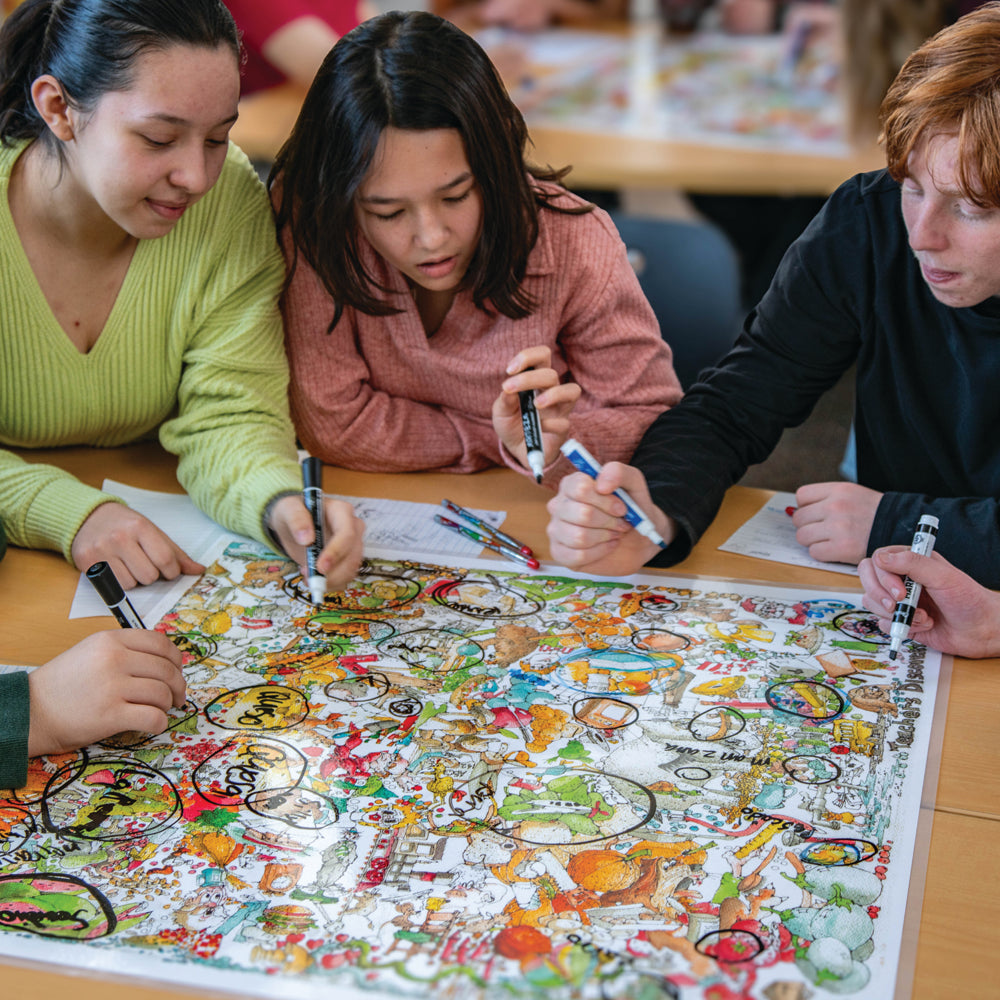 Gamify first-year vocab with ¡Busca! ¡Busca! Students form teams around hand-illustrated dry-erase posters. The teacher reads a list of provided Spanish vocab words out loud. Students write the words, then race to find the corresponding objects on the crazy, chaotic, all-mixed-up poster. When they find each object, students write the vocab word over it, then SHOUT IT OUT! The fastest team is the winner!