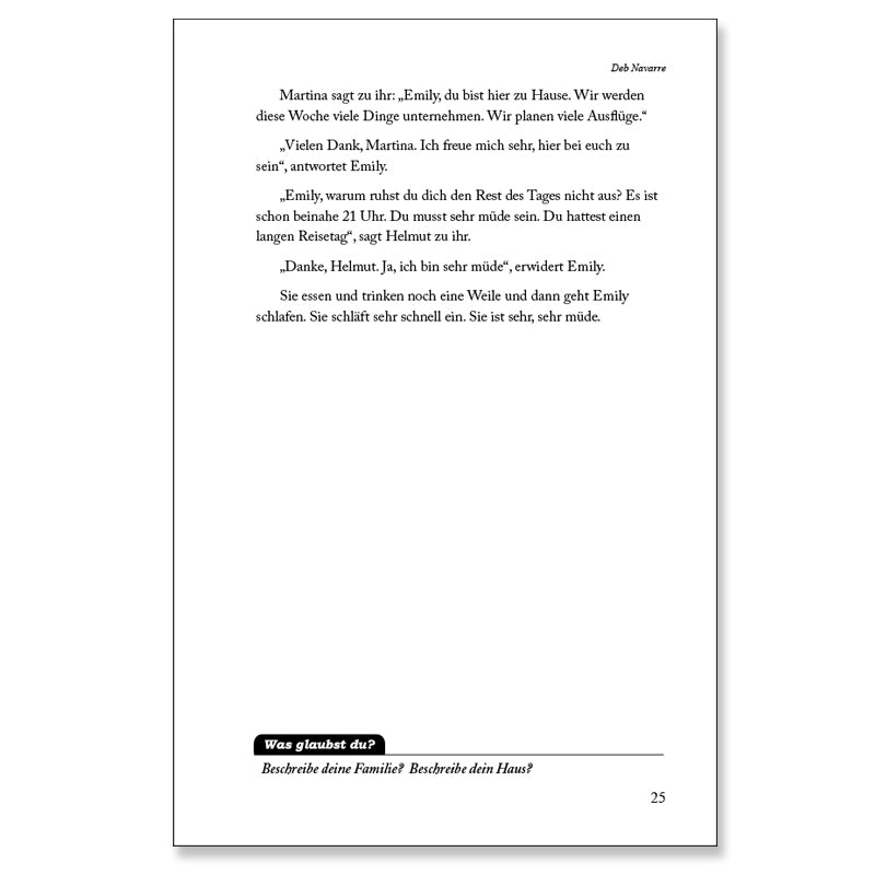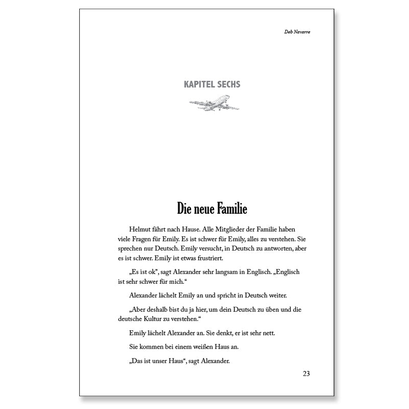 German students are powerless to resist these tales of homework and heartbreak, travels abroad and troubles at school, young love and true friendship! Relatable characters and school-appropriate yet teen-relevant themes draw students in, immersing them in first-year grammar and vocabulary topics. Use Deb Navarre readers with your Level One German classes or as review with higher levels. This highly readable series is written almost entirely in the present tense, and each one is supported by a thorough glossary containing all the structures and vocabulary used in each reader. Comprehension questions in German at the end of each chapter help students check their understanding, plus a What Do You Think? question for oral or written completion. The best way to encourage reading in any language is to provide interesting content. Deb Navarre readers are full of themes teens want to read about!
