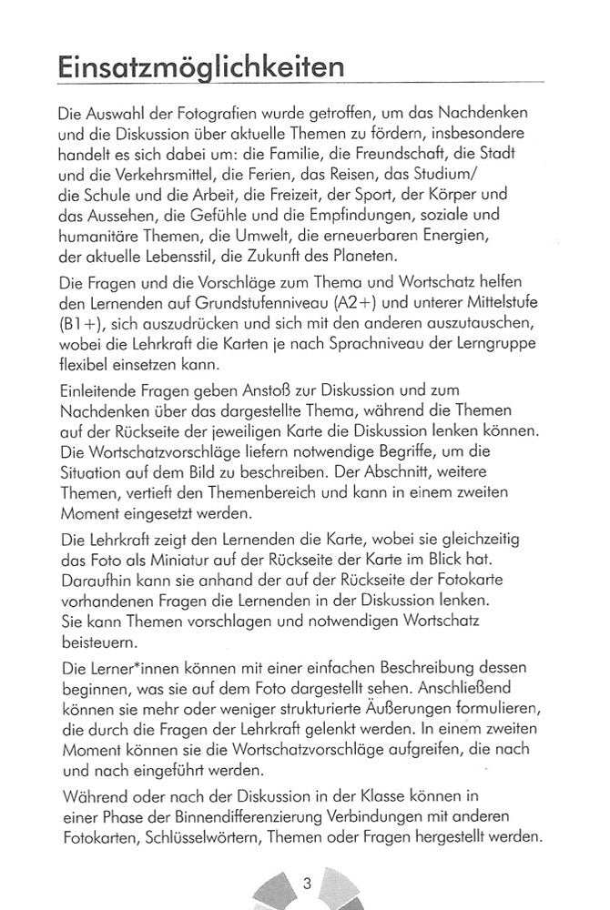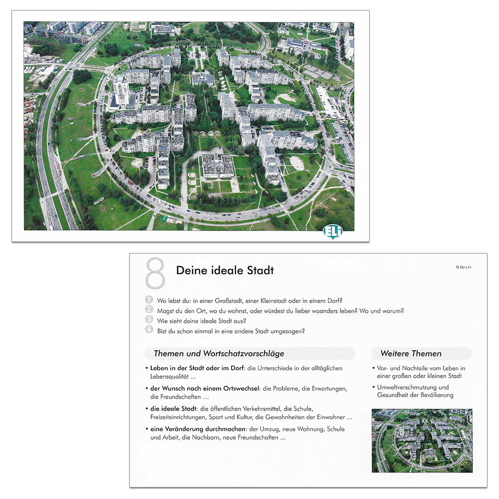 Listening, speaking, and oral interaction skills are developed around 75 images pertaining to the environment, society, and personal experiences that encourage learners to express themselves, converse with others, and share ideas. An ideal didactic tool for small group or partner work. All cards have a meaningful photograph presenting topical issues of general interest. On the back side are a series of questions related to the topic presented, vocabulary fields, and suggestions that provide helpful stimuli for discussion and conversation, plus additional topics with which the discussion can be extended.
