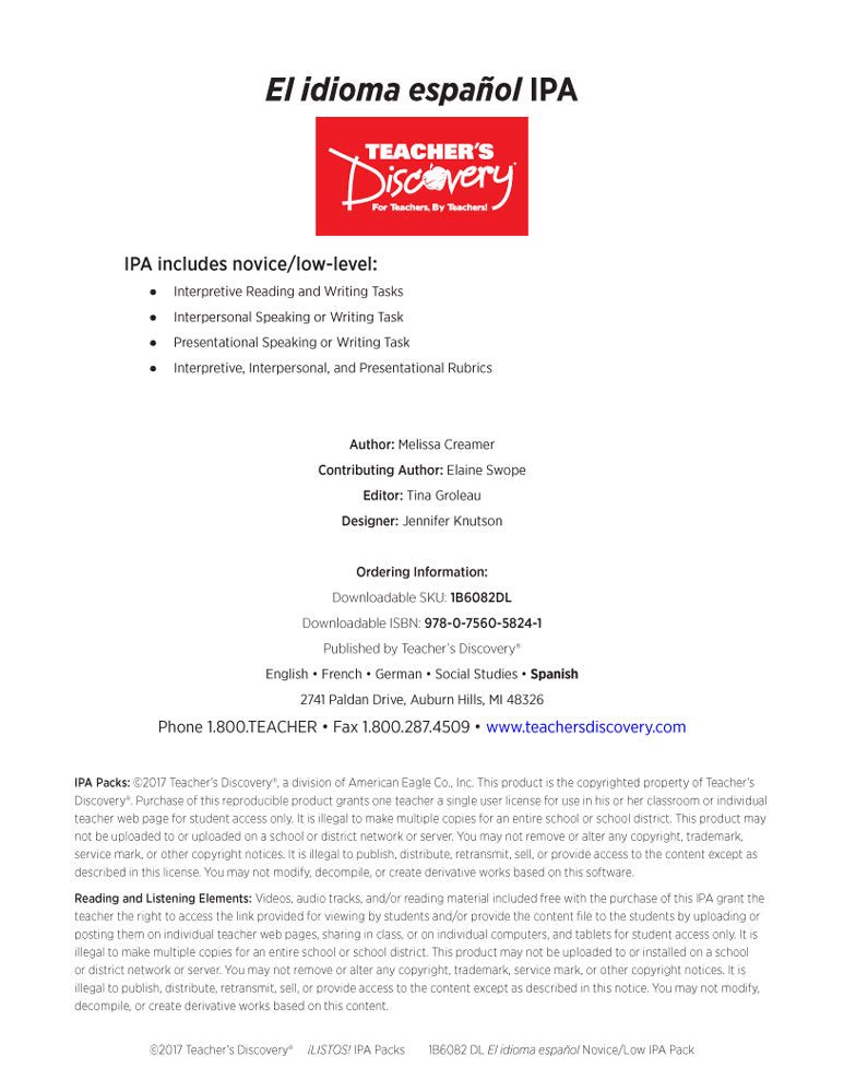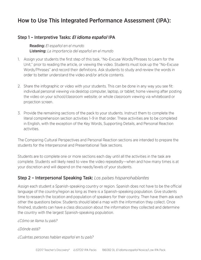 This pack includes step-by-step instructions, and reading and listening comprehension activities that follow the ACTFL model. Complete with an explanation of an IPA and how to use it, and nine Interpretive Tasks that break down the content, increase recognition of key words and phrases, develop context awareness, and promote language usage. In addition, it provides creative options for writing and/or speaking Interpersonal and Presentational Tasks, answer keys, and rubrics for each mode.