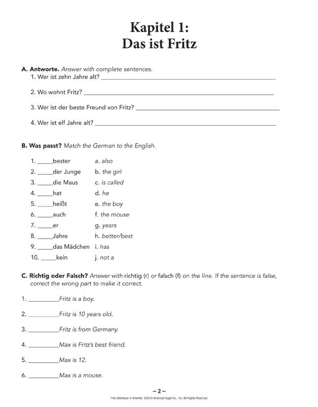 The activity book contains a student worksheet and a quiz for each of Fritz's twelve chapters. Enhance the reader experience and your students’ comprehension with our extra, book-related activities. The perfect teacher tool for a lively German class! Answer key included.