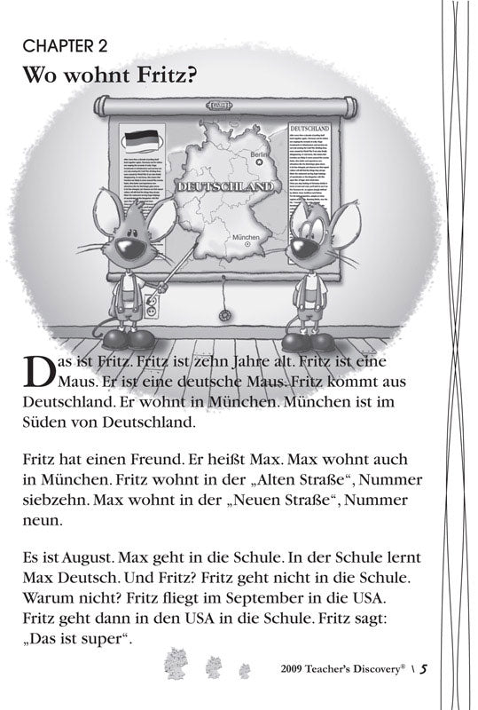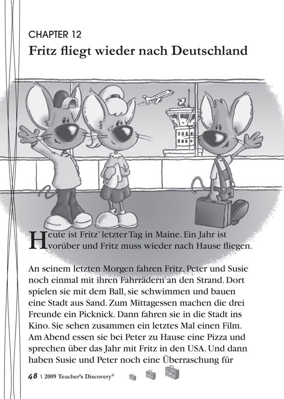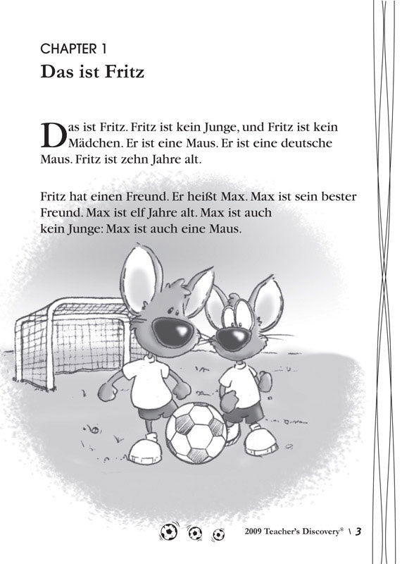 Meet Fritz, a 10-year-old German mouse who travels to the United States to spend a year in Bangor, Maine with Peter and his family. A likable, Lederhosen-wearing mouse, Fritz does all the typical things American kids do, like going to the mall and the beach. Fritz likes soccer and is annoyed by chatty girls. Designed to be read in the first few months of German class, the book contains a complete vocabulary list, plus comprehension questions.