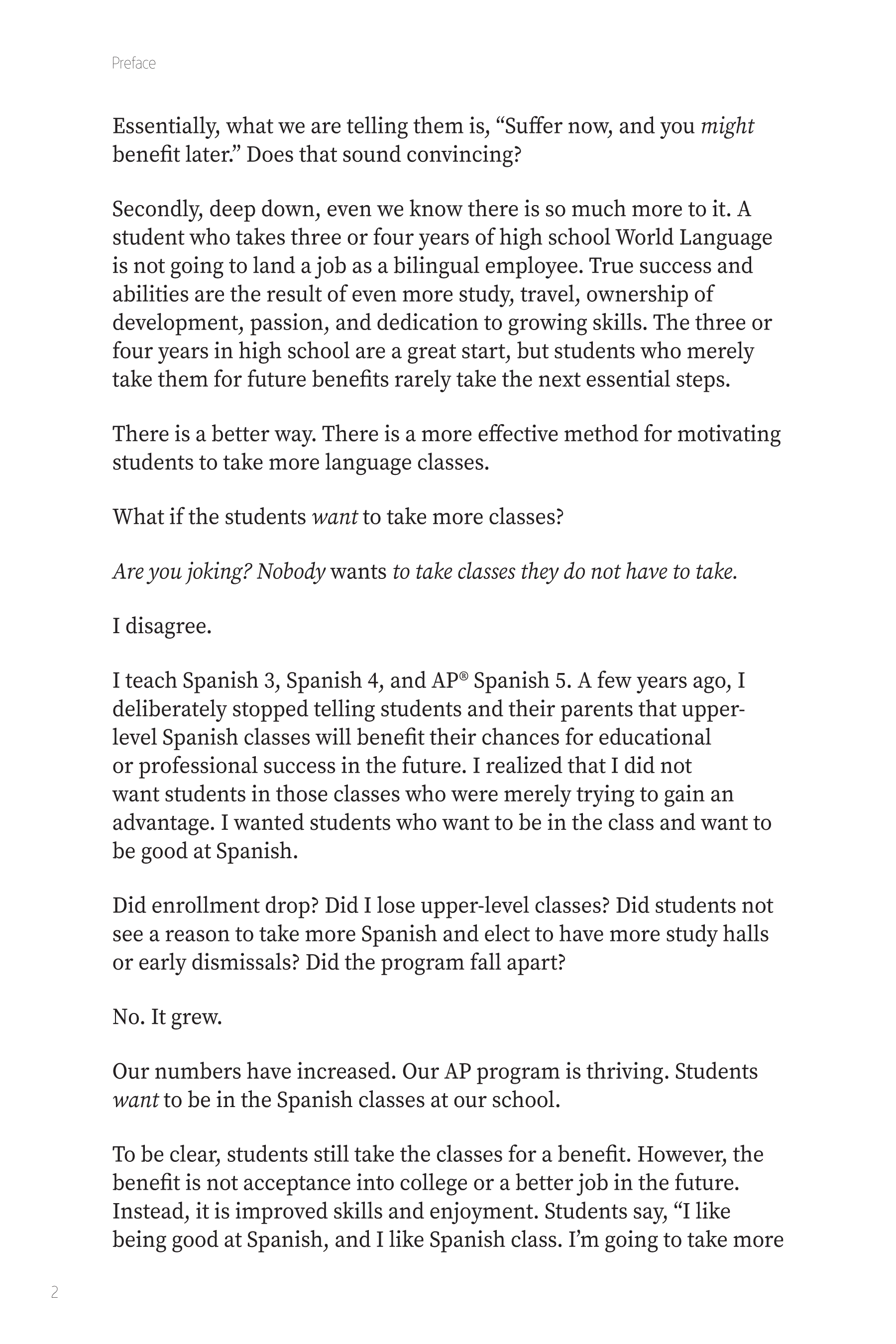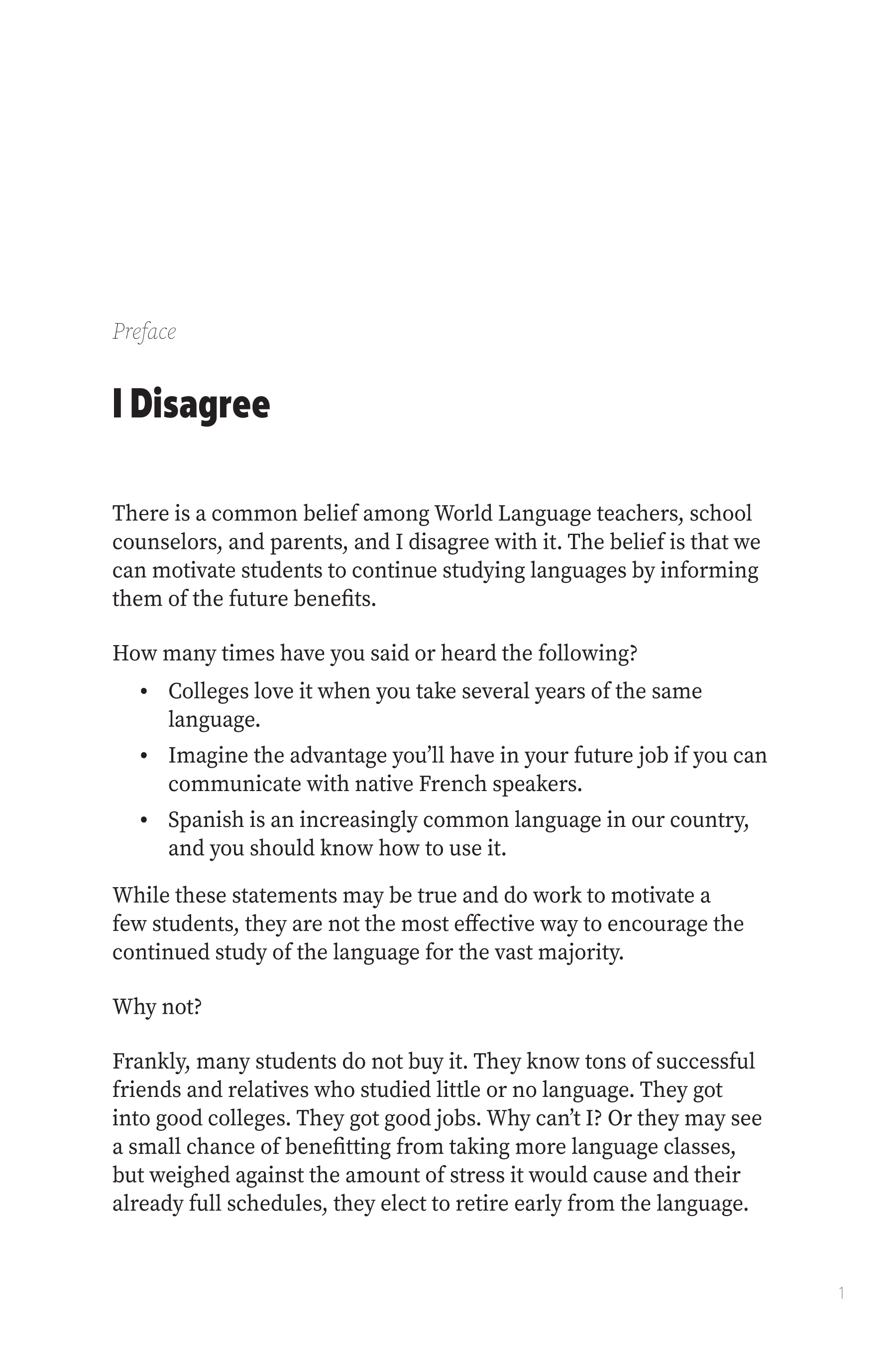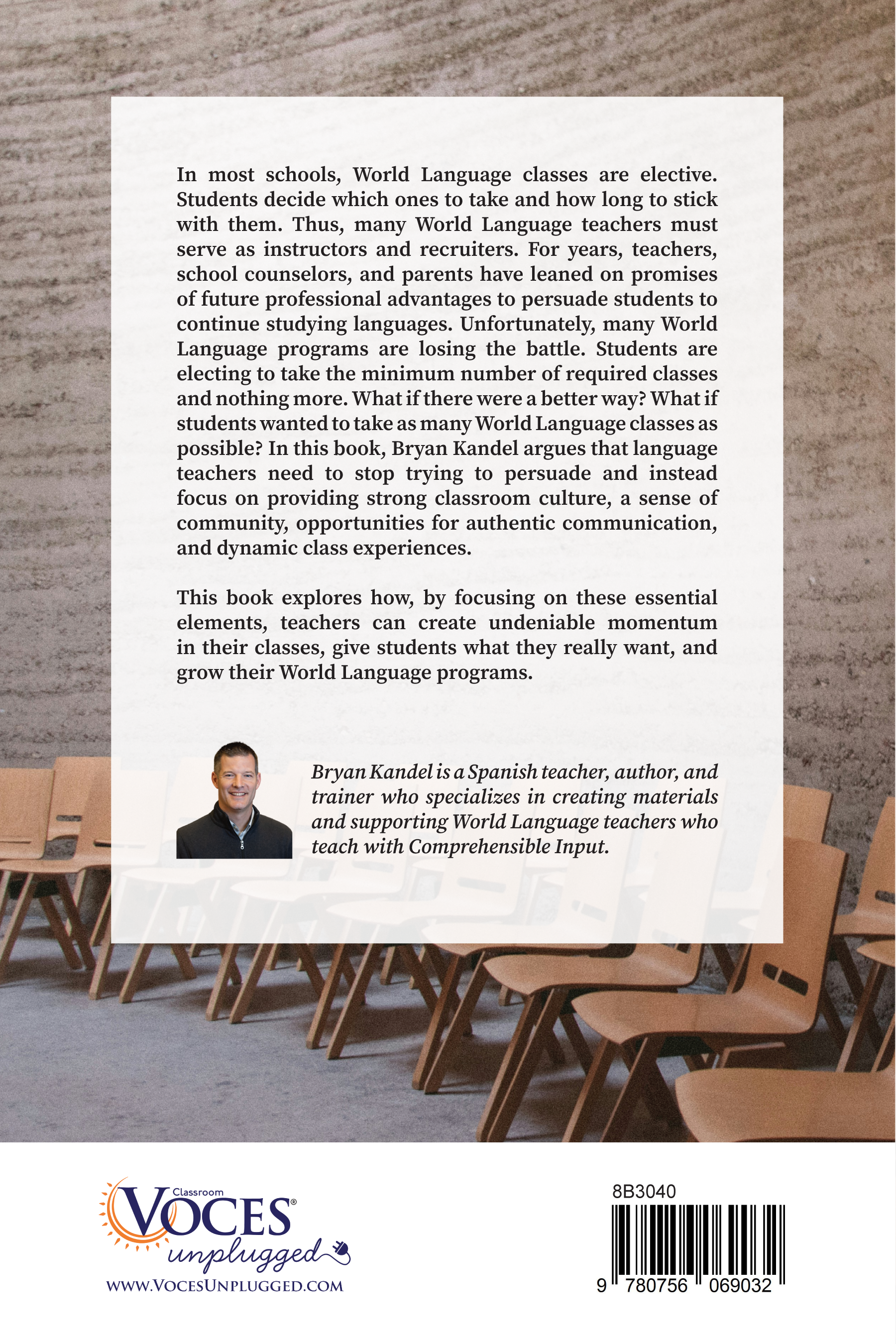 In most schools, World Language classes are elective. Students decide which ones to take and how long to stick with them. Thus, many World Language teachers must serve as instructors and recruiters. For years, teachers, school counselors, and parents have leaned on promises of future professional advantages to persuade students to continue studying languages. Unfortunately, many World Language programs are losing the battle. Students are electing to take the minimum number of required classes and nothing more. What if there were a better way? What if students wanted to take as many World Language classes as possible? In this book, Bryan Kandel argues that language teachers need to stop trying to persuade and instead focus on providing strong classroom culture, a sense of community, opportunities for authentic communication, and dynamic class experiences.